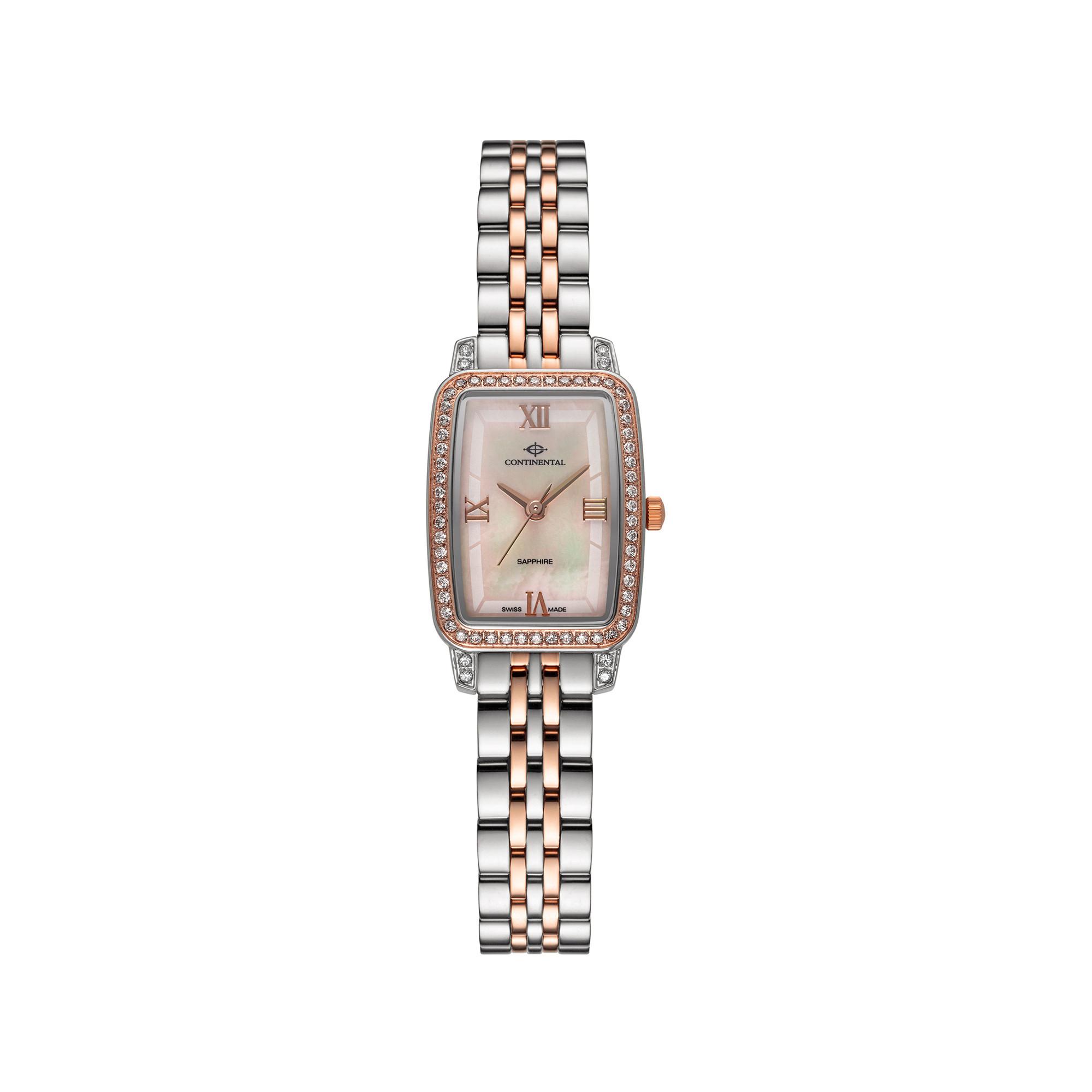 Diese Damenuhr verfügt über ein Gehäuse und Armband aus Edelstahl, ein rosafarbenes Perlmuttzifferblatt und Saphirglas. Sie ist wasserdicht bis 30 Meter und hat ein RL 753 Uhrwerk mit Batterie-Ende-Anzeige durch 4-Sekunden-Sprünge des Sekundenzeigers.