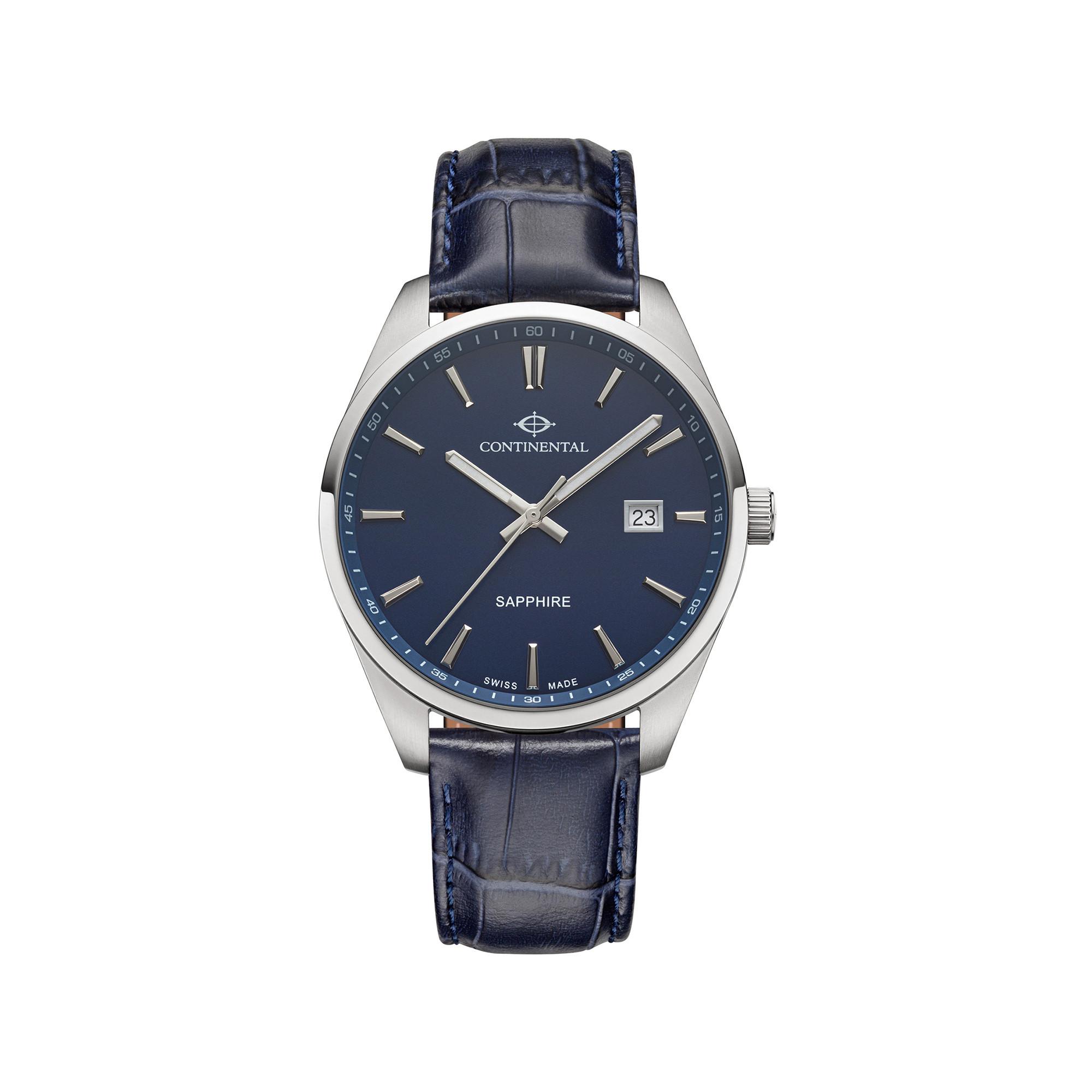 Diese Herrenuhr hat ein Gehäuse aus Edelstahl mit einem Durchmesser von 41 mm, ein Armband aus Leder, ein blaues Zifferblatt und Saphirglas. Sie ist bis 50 Meter wasserdicht.