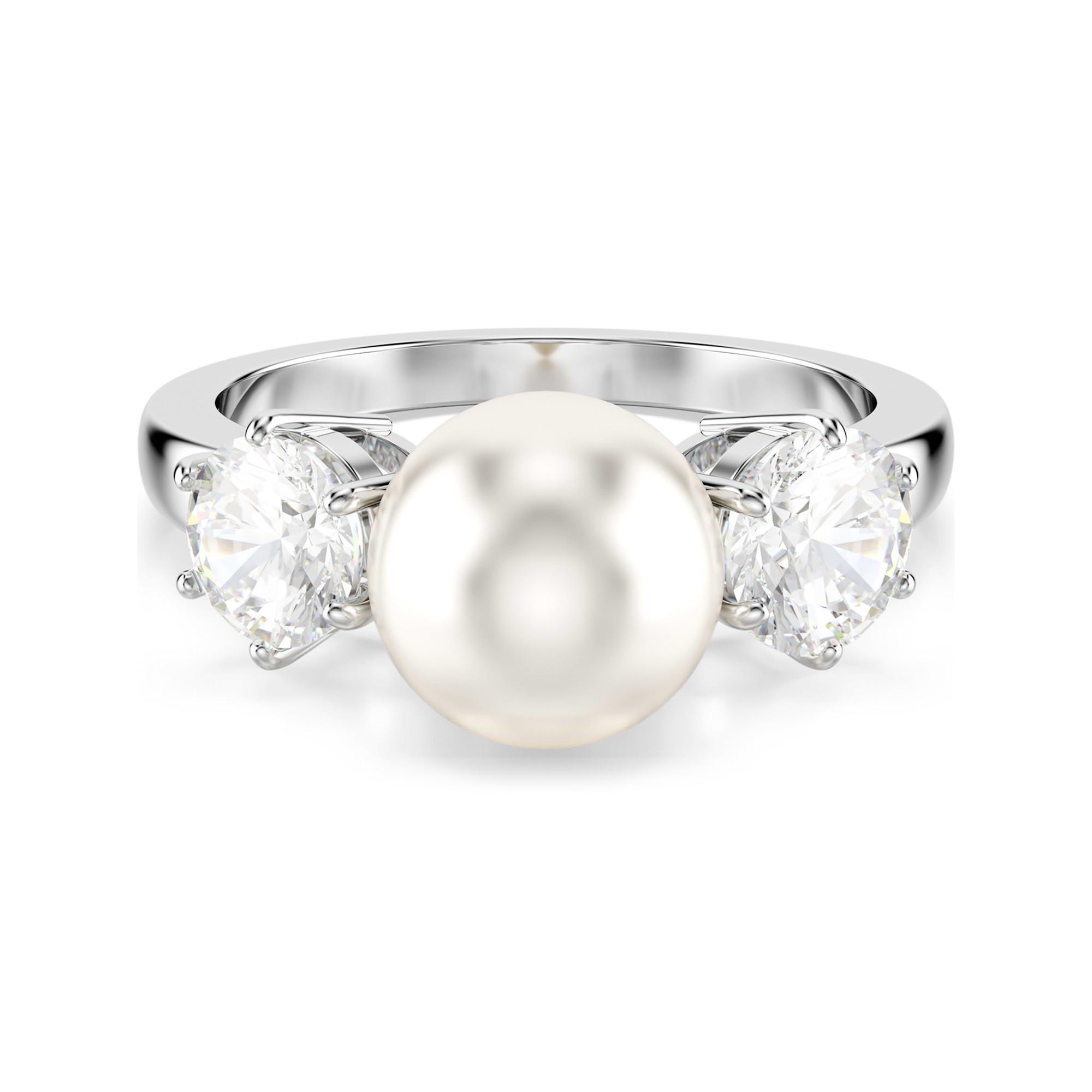 Dieser edle Matrix Cocktailring bringt frischen Wind in klassische Formen. Die mittlere, weisse Swarovski Kristallperle sowie links und rechts krallengefassten Swarovski Zirconia heben das rhodinierte Design aus dem Alltag. Ein luxuriöses Schmuckstück, das sofort Eleganz verspricht.