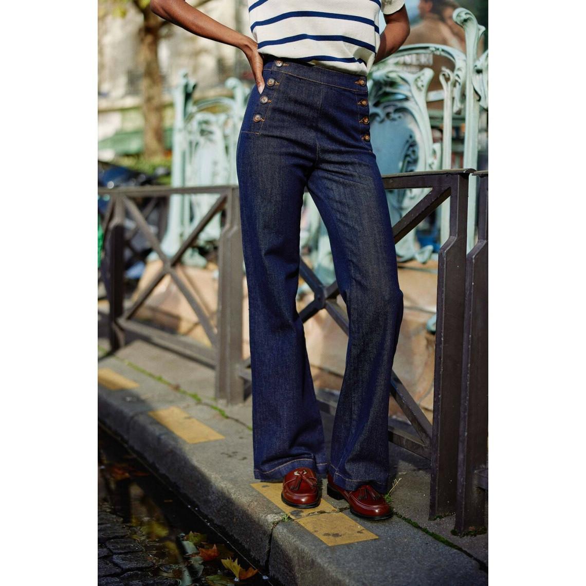Diese hochgeschnittene Denim-Hose von La Petite Etoile mit doppelter Knopfleiste, ausgestelltem Bein und paspelierten Gesässtaschen ist eine elegante, feminine Freizeithose mit französischem Charme.
