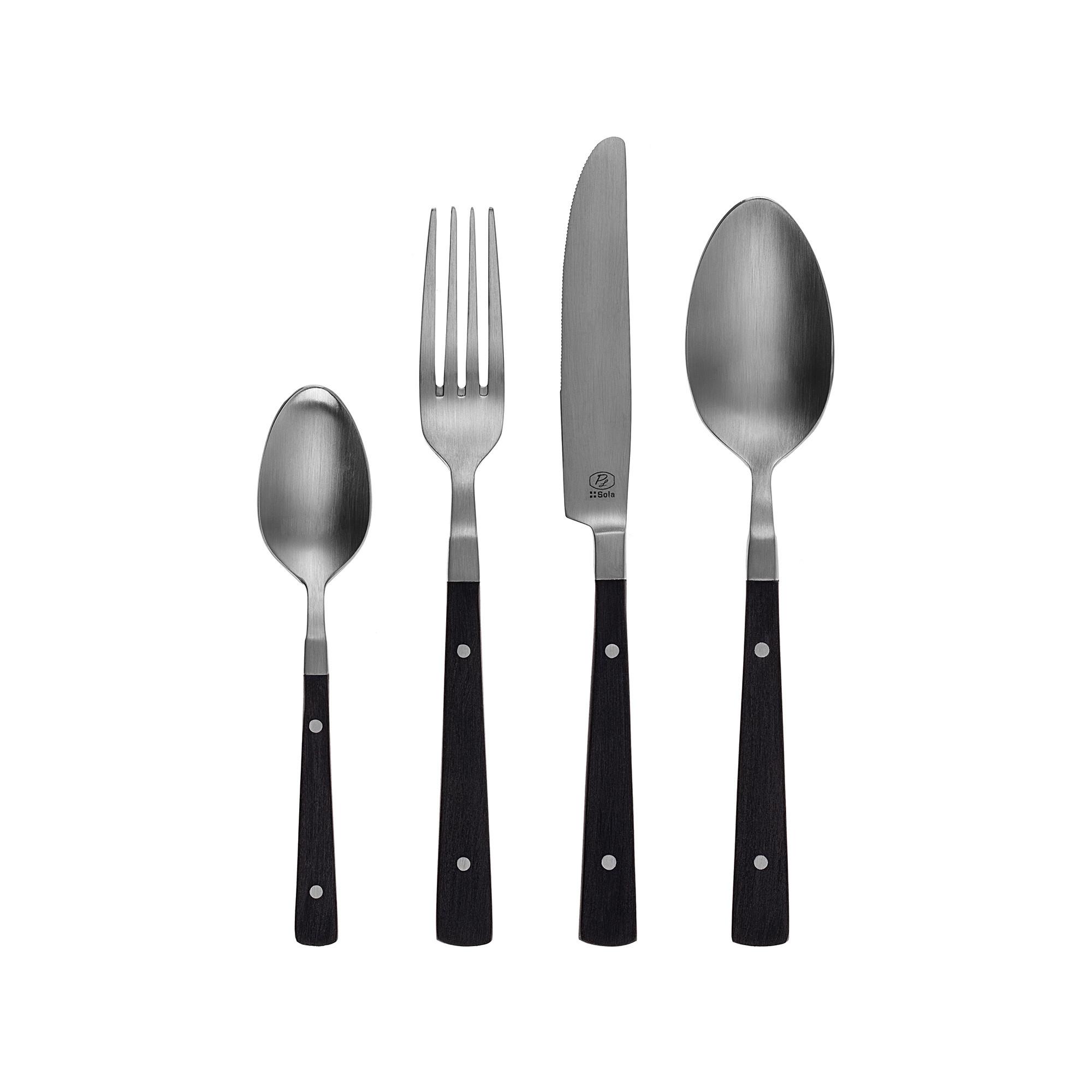 Die handgefertigten Griffe des Bestecksets Irina bestehen aus schwarzem POM-Kunststoff, der eine hohe Festigkeit, Härte und Feuchtigkeitsbeständigkeit aufweist. Sie lassen sich leicht reinigen und dank der glatten Oberfläche fühlen sie sich angenehm an.