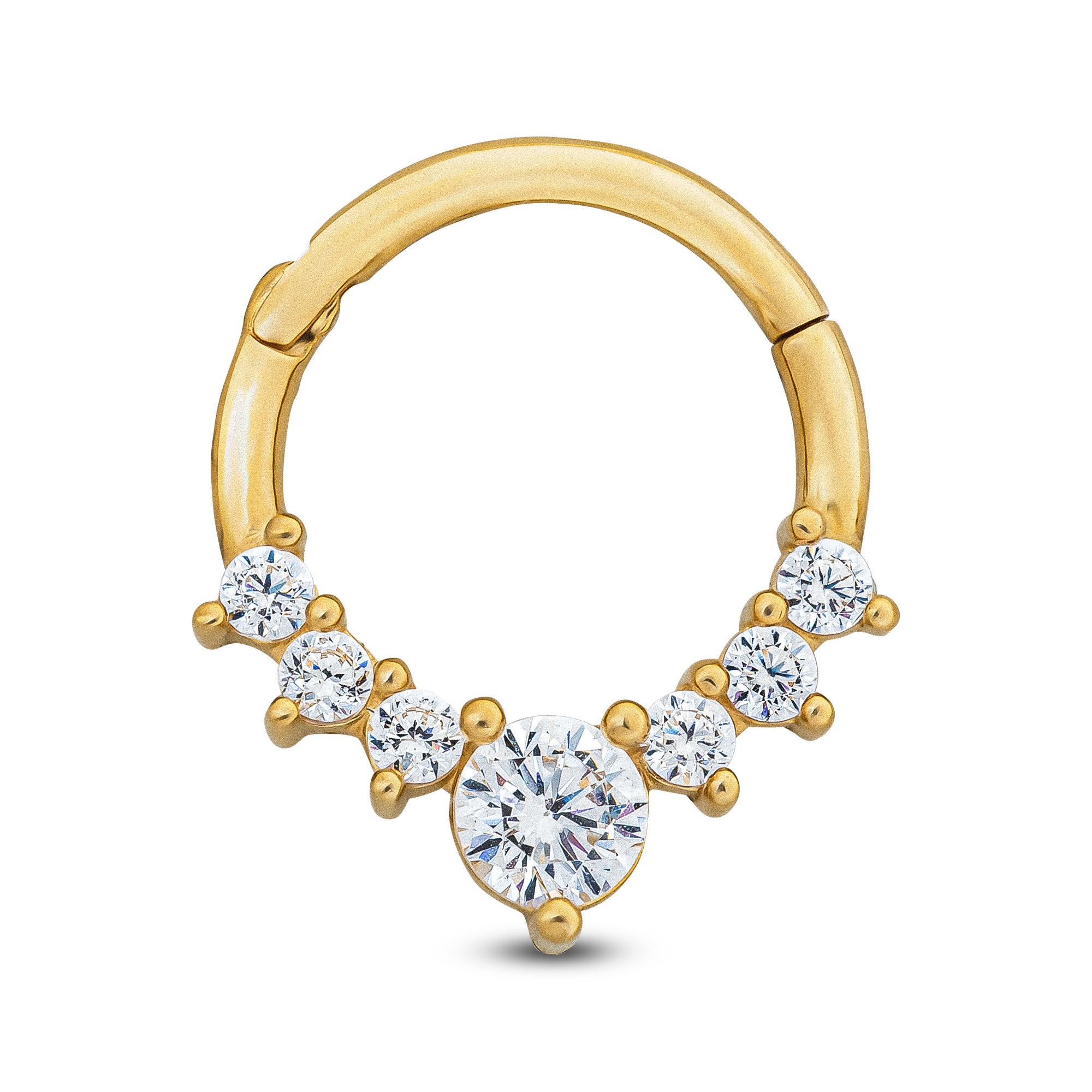 Dieses Piercing von L'Atelier Gold aus 18-karätigem Gold steht für zeitlose Eleganz mit einem Hauch Glamour und Raffinesse. Seine sieben symmetrisch angeordneten Zirkoniasteine verleihen dem Piercing einen wundervollen Glanz und sorgen für ein edles Funkeln in jeder Lichtsituation. Dieses Piercing ist nicht nur ein Accessoire, sondern ein Ausdruck von Stil und Klasse. Es ist perfekt für besondere Anlässe oder um dem Alltagslook einen luxuriösen Touch zu verleihen.