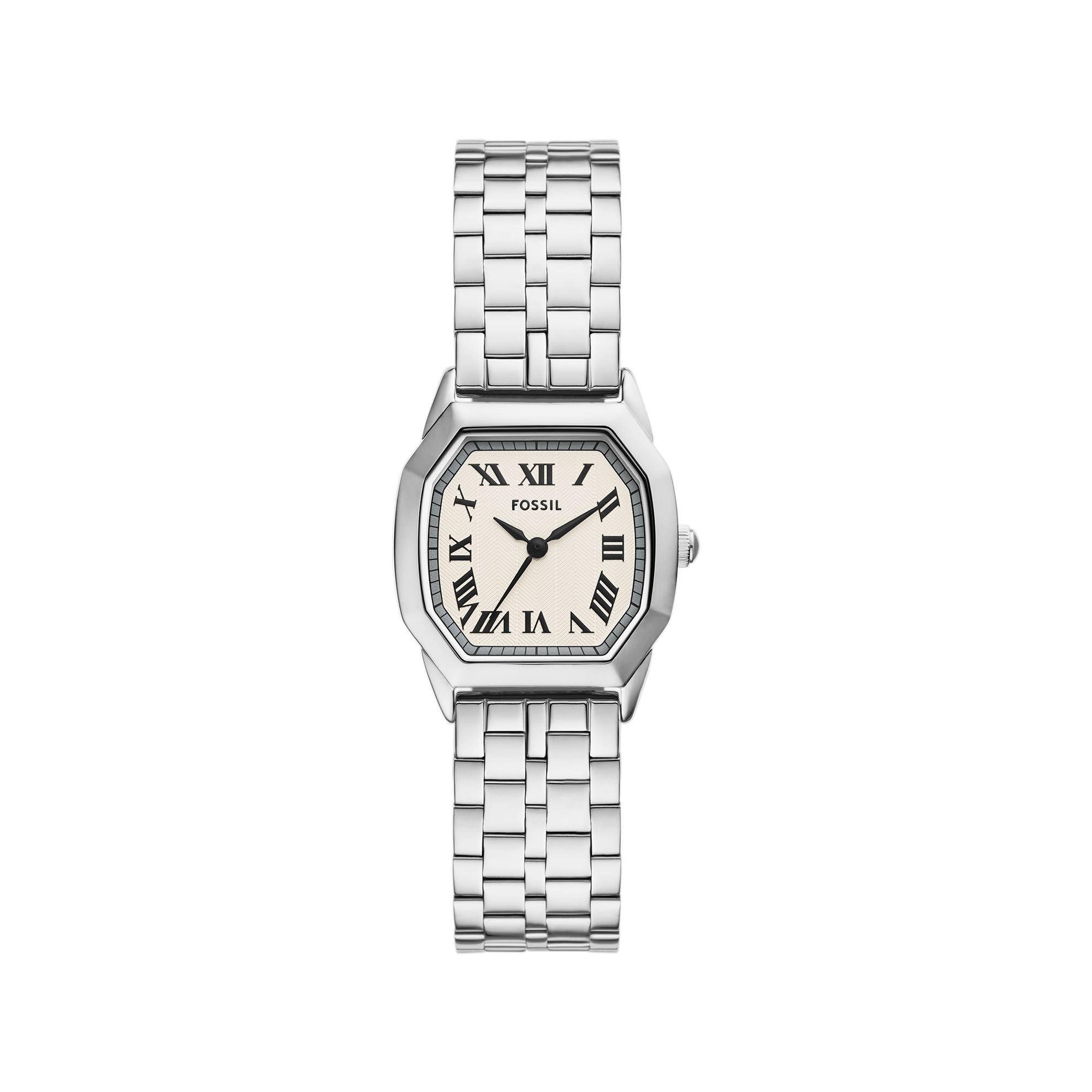 Diese Fossil Uhr aus der HARLOW-Serie zeichnet sich durch ein 27 mm grosses, achteckiges Gehäuse aus silberfarbenem Edelstahl und ein cremefarbenes, strukturiertes Zifferblatt aus. Sie verfügt über ein 3-Zeiger-Quarzwerk, ist bis 3 ATM wasserdicht und hat ein poliertes, fünfgliedriges Edelstahlband mit Doppelfaltschliesse, einer Bandbreite von 16 mm und einem Umfang von 175 +/- 5 mm.