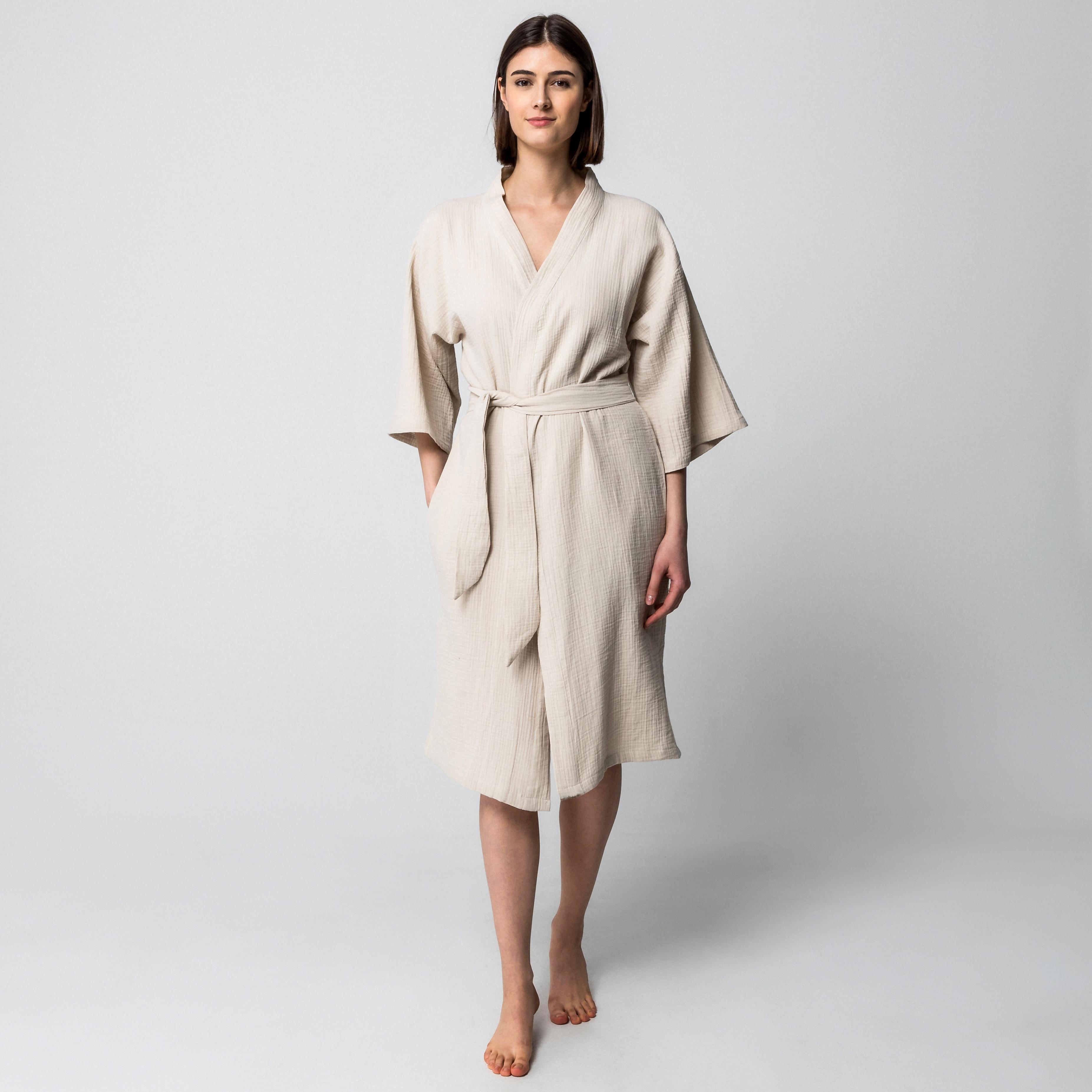 Dieser Oyama Kimono aus weichem Musselin aus reiner Baumwolle ist mit weitem bequemem Schnitt, breitem Bindegürtel und 3/4-Ärmeln ein sinnliches Highlight, das mit puristischem Style und hohem Tragekomfort Spa-Gefühle beschert.