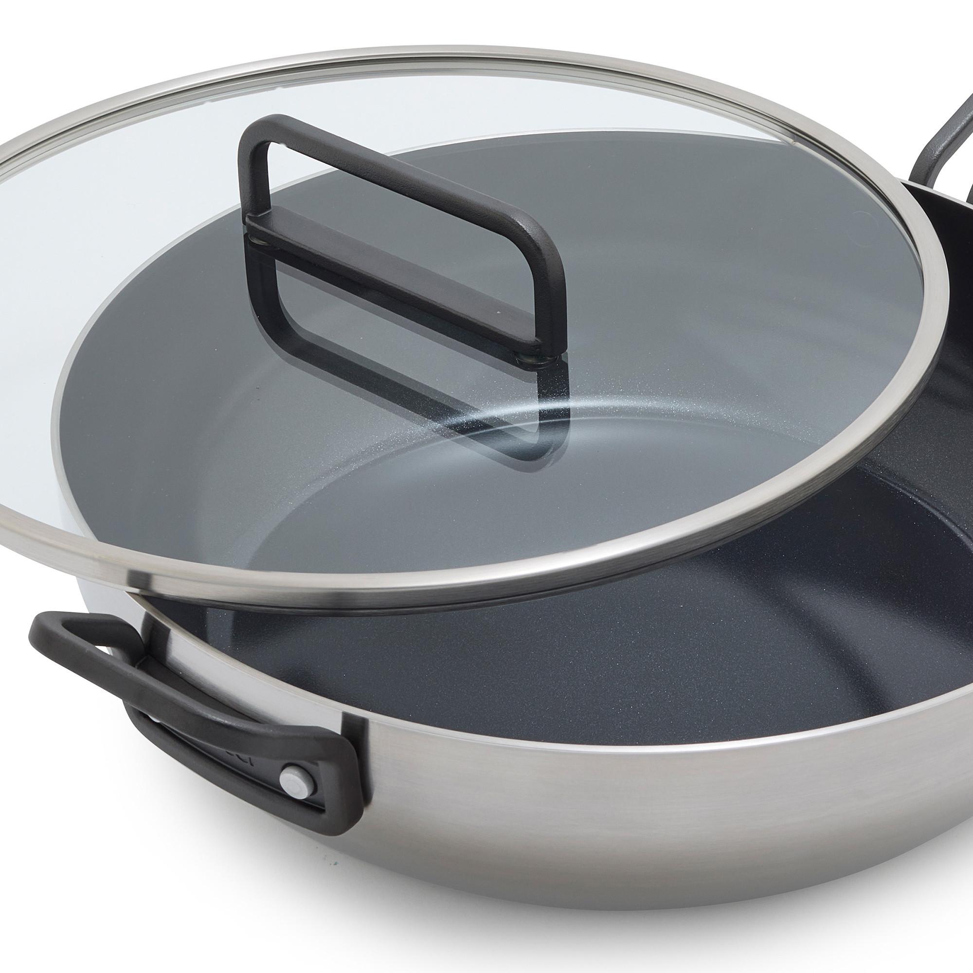 Stanley Tucci hat sich mit GreenPan zusammengetan, um eine Kochgeschirr-Kollektion von Grund auf zu entwickeln, die sich auf Innovationen konzentriert, die das Kochen auf die nächste Stufe heben. Die in Italien in der High-Tech-Anlage von GreenPan hergestellten Pfannen vereinen raffinierte architektonische Details mit bahnbrechender Technologie. Diese geräumige Pfanne ist ideal für die Zubereitung von Mahlzeiten für eine grosse Gruppe oder für grosse Fleischstücke. Die hochmoderne Plasma-Tech-Behandlung ergänzt die hochmoderne keramische Antihaftbeschichtung von GreenPan und sorgt für eine bemerkenswerte PFAS-freie Leistung und unvergleichliche Haltbarkeit. Die dreilagigen Edelstahlkörper von GreenPan sind für den täglichen Gebrauch ausgelegt, bis hin zu den geschlossenen Rändern, die Schäden an der Beschichtung verhindern. Jeder Aspekt dieser Pfanne wurde individuell für den täglichen Gebrauch durchdacht, von der grossen Oberfläche bis zum Griff aus Edelstahlguss. Es ist ein Kochgeschirr für Menschen wie Stanley Tucci, die gerne kochen.