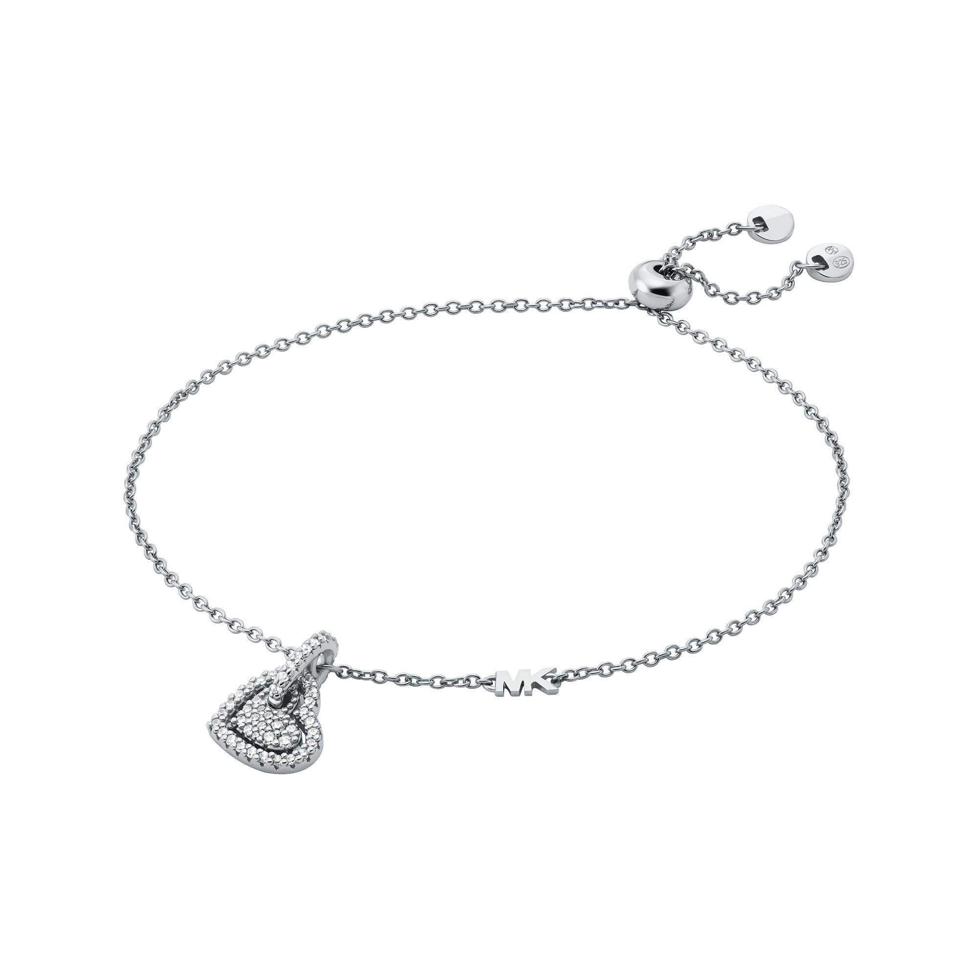 Dieses Armband von Michael Kors für Damen besteht aus 925er Silber und ist mit Zirkonia-Steinen besetzt. Es hat einen Knebelverschluss und ist im Design „Herz & Liebe“ gehalten, mit verstellbarer Länge.