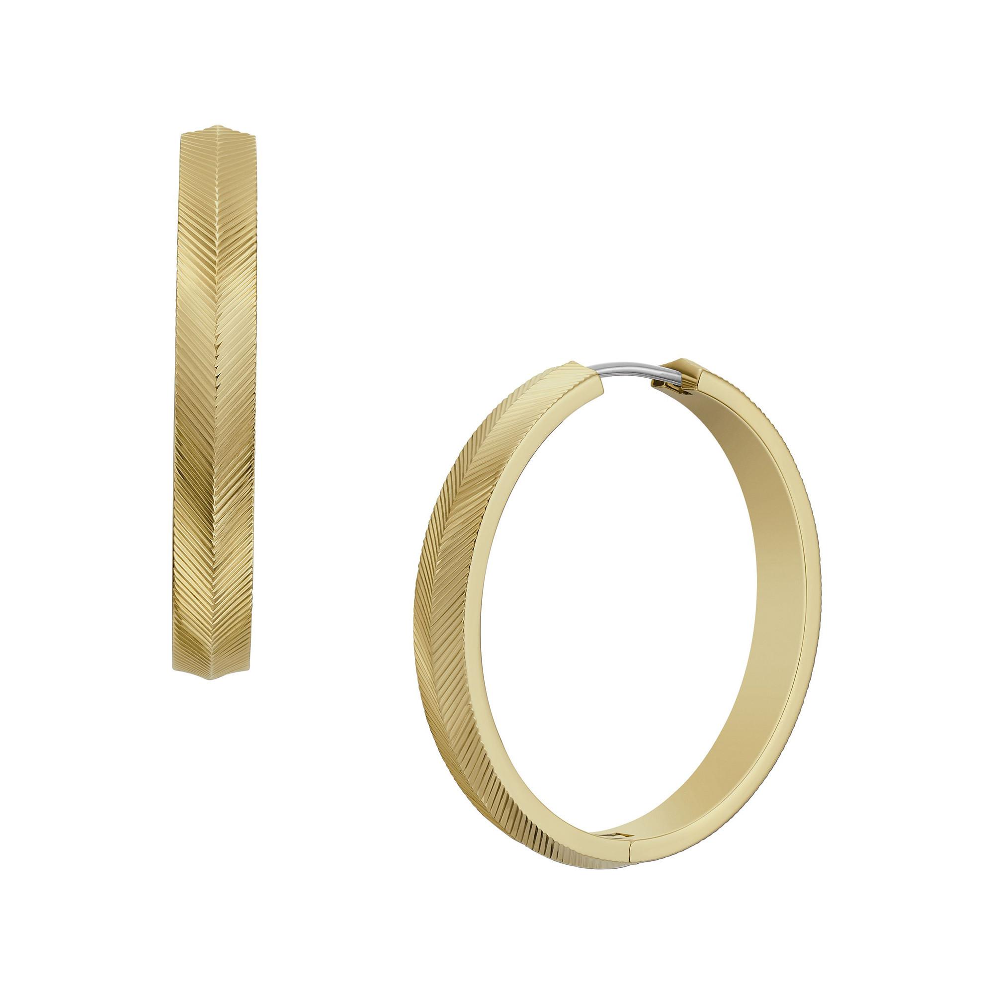 Diese fein geätzten, strahlenden Creolen-Ohrringe Harlow für jeden Tag gehören zu Fossils atemberaubendsten Accessoires. Die feine lineare Textur funkelt im Licht und sorgt für einen dezenten Glanz.