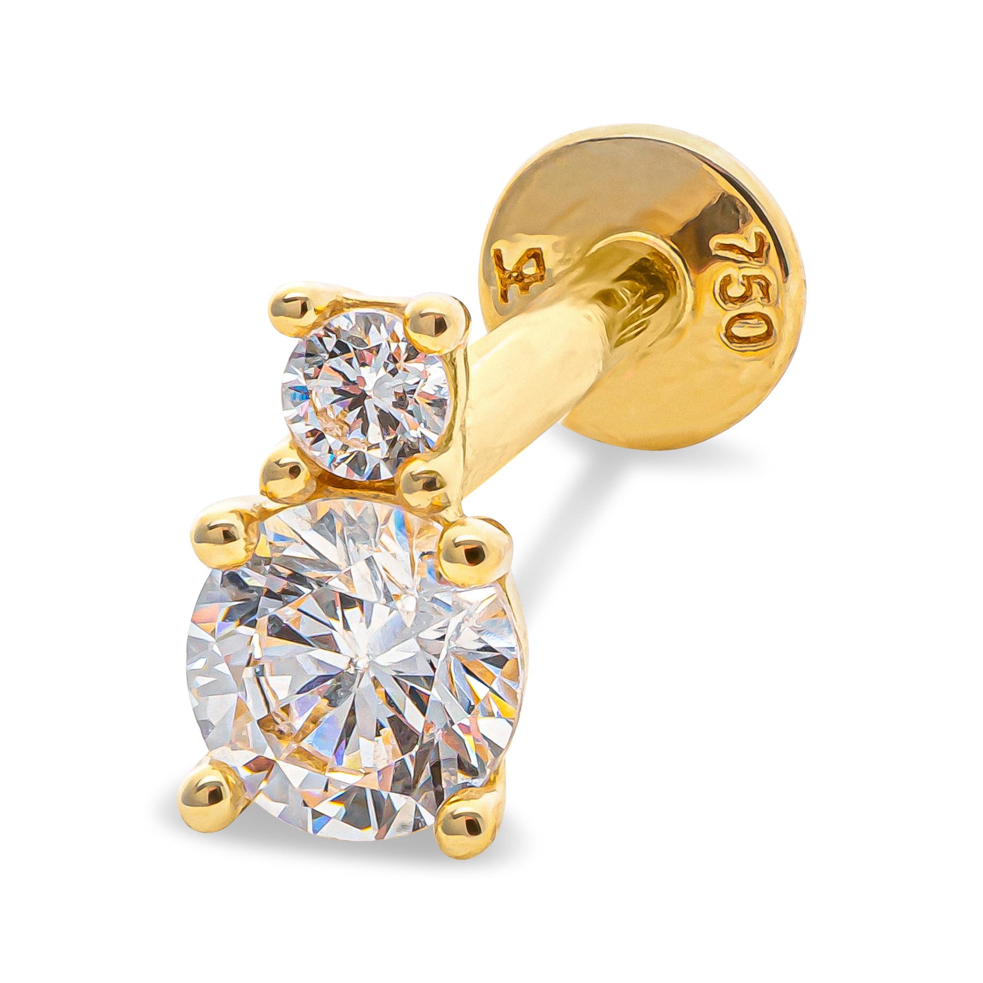Dieses Piercing von Studio Marquise aus 18-karätigem Gelbgold mit den klassischen, facettierten Zirkonia-Steinen in Krappenfassung hat einen Drehverschluss mit flacher Rückseite.