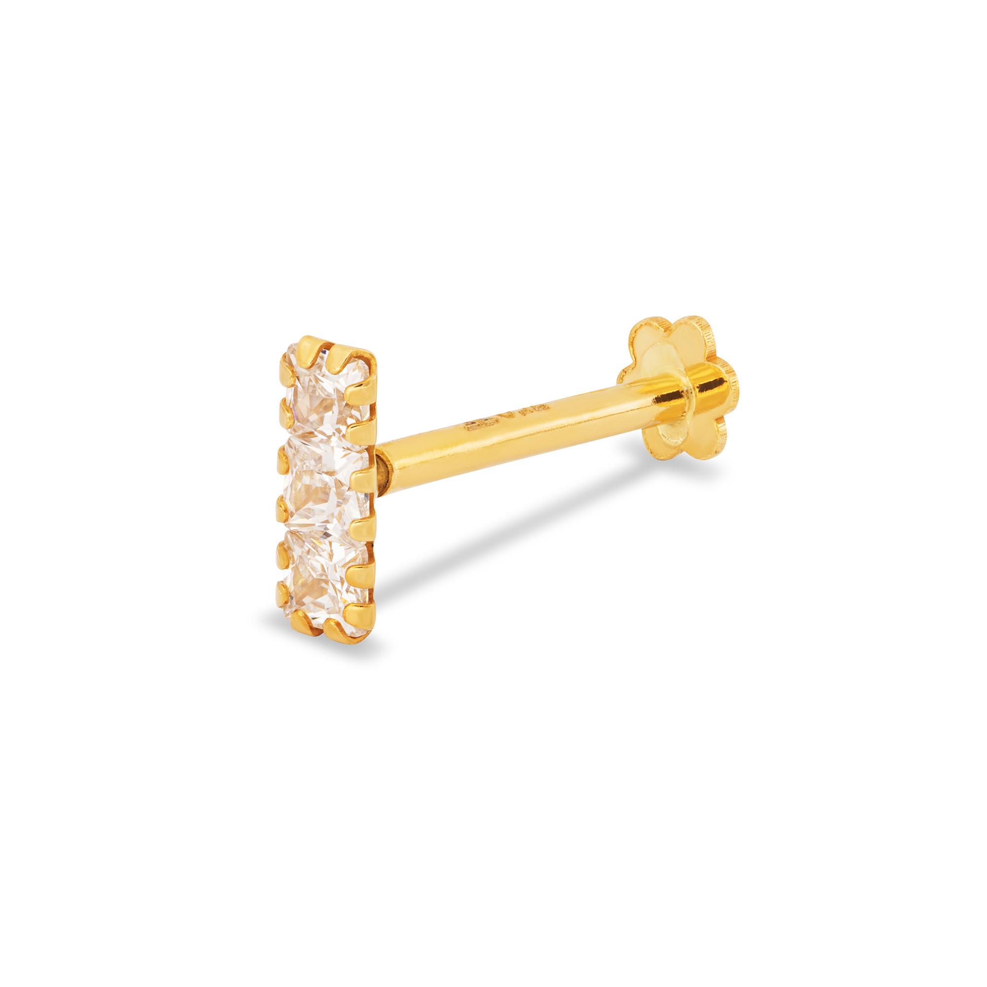 Dieser Einzelohrstecker von Studio Marquise ist aus reinem Gelbgold und Zirkonia gefertigt, mit puristischem Design und flachem, blumenförmigem Drehverschluss.