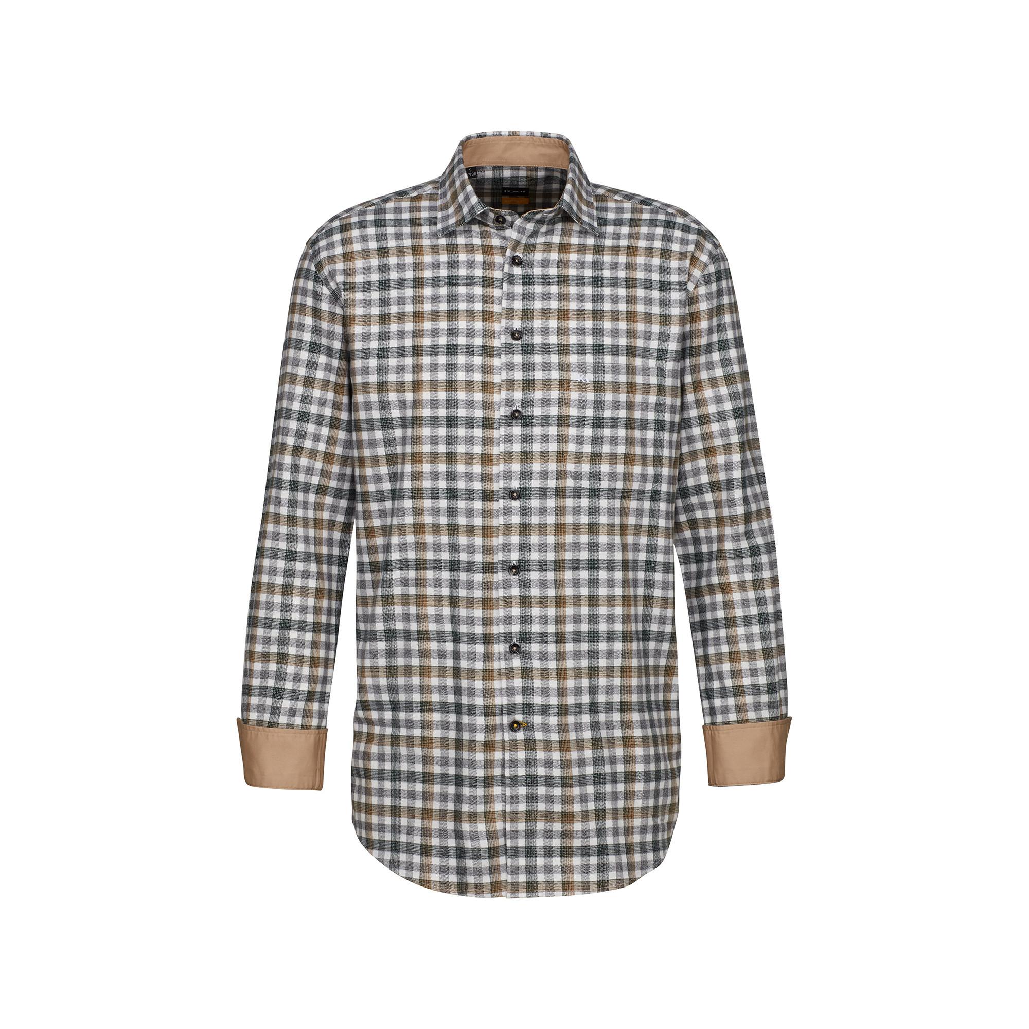 Unser Verona kariertes Herren-Flanellhemd mit Kent-Kragen ist in der Modern Fit Passform mit leicht tailliertem Schnitt für sportliche Herren gefertigt. Das blickdichte Gewebe aus 100% veredelter Baumwolle in feiner Karomusterung und die farblichen Akzente an Kragen und Manschetten in elegantem Beige machen das Hemd zu einem wahren Kombinationstalent für sportive Outfits, die modern und klassisch zugleich sind. Dank des speziellen easy care ausgerüsteten Baumwollstoffes ist unser kariertes Herren-Flanellhemd Verona mit Kent-Kragen zudem knitterarm und pflegeleicht.