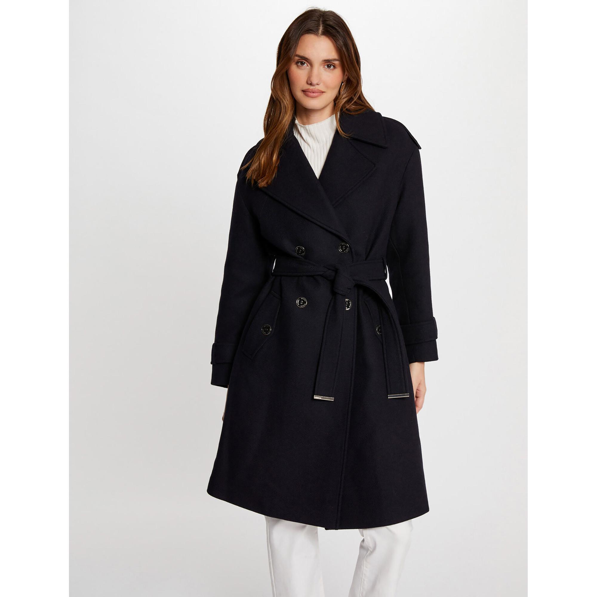 Dieser klassische Mantel von Morgan hat einen Reverskragen und eine doppelreihige Knopfleiste vorne. Er verfügt über zwei Pattentaschen mit einem Knopf sowie einen passenden Bindegürtel.