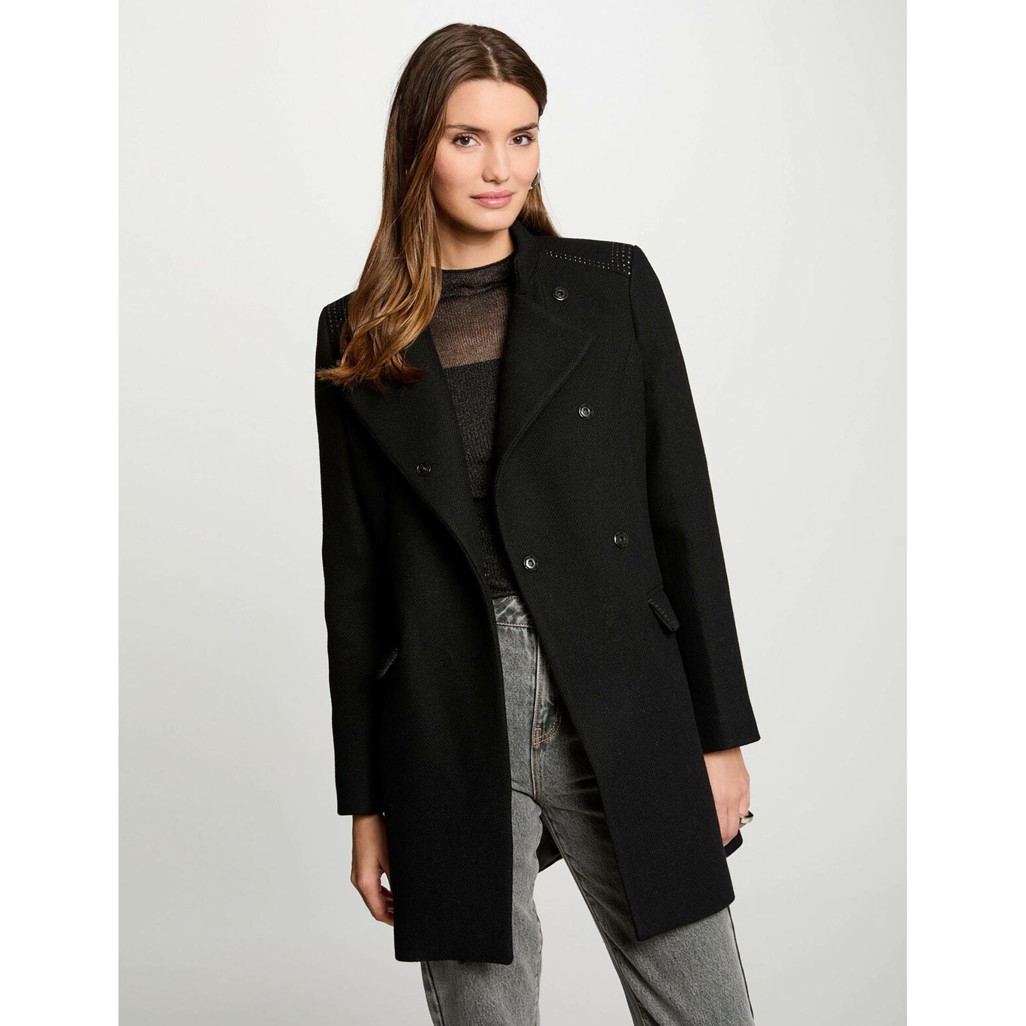 Dieser Mantel von Morgan hat eine taillierte Passform und ist mit Schulterpolstern ausgestattet. Er verfügt über einen Knopfverschluss vorne, zwei Pattentaschen und ist doppelreihig designt. Strass-Details an den Schultern und Taschen verleihen ihm einen besonderen Glanz.