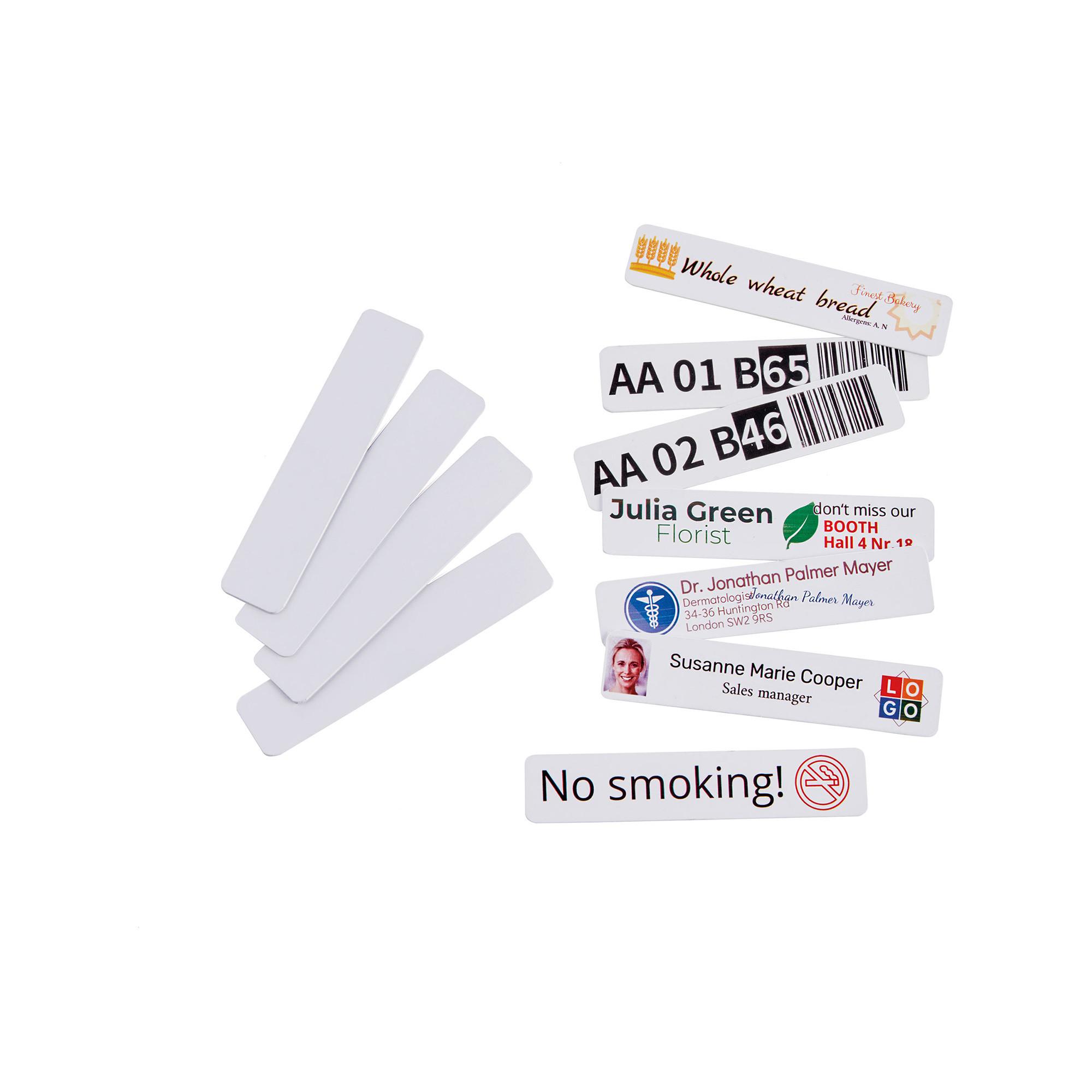 Klebenden Kunststoffschilder – eine vielseitige Lösung für Ihre Beschriftungsanforderungen. Jede Packung enthält 50 Schilder mit den Massen 80 mm x 18 mm x 0,76 mm. Diese einseitig klebenden Etiketten sind leicht kratzfest und gewährleisten so eine hohe Haltbarkeit für verschiedene Anwendungen. Beständig gegen Wasser und Umweltlösungsmittel bieten diese Schilder Langlebigkeit in unterschiedlichen Umgebungen. Beachten Sie bitte, dass sie nicht mit schwarzer Pigmenttinte kompatibel sind. Verwenden Sie das e-mark oder e-mark go Lineal für eine präzise Positionierung des Abdrucks. Diese bedruckbaren Kunststoffschilder eignen sich ideal zur Kennzeichnung von Artikeln, Regalen oder als Namens- und Preisschilder. Die Klebeschicht auf der Rückseite ermöglicht ein einfaches Aufbringen der Schilder.