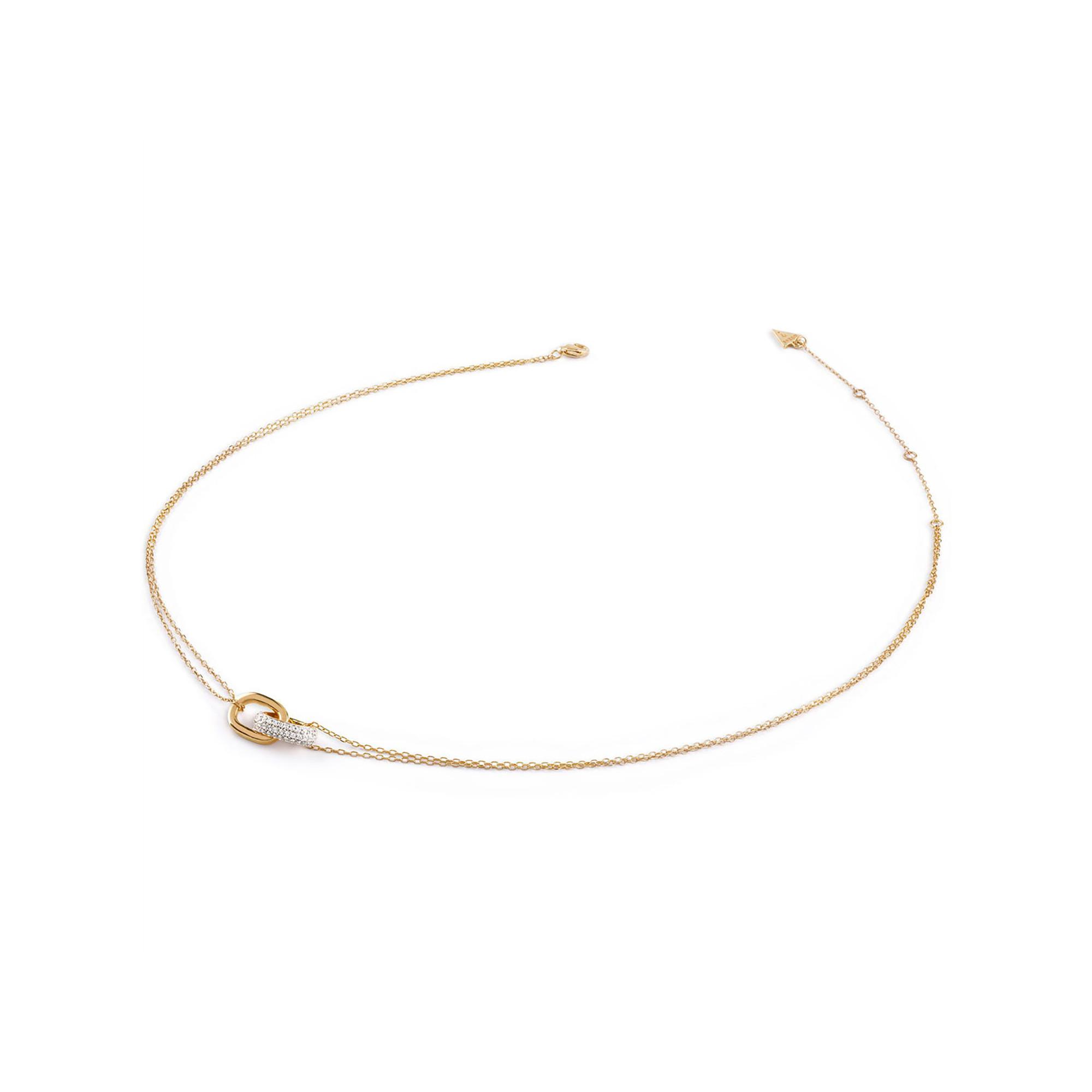 Die Guess Nuances Halskette für Damen ist aus vergoldetem Silber gefertigt und besticht durch eine feine, elegante Kette mit einem Anhänger aus zwei ineinandergreifenden Gliedern – eines glatt, das andere mit weissen Zirkonia besetzt. Der Verschluss ist durch eine verlängerbare Kette individuell anpassbar.