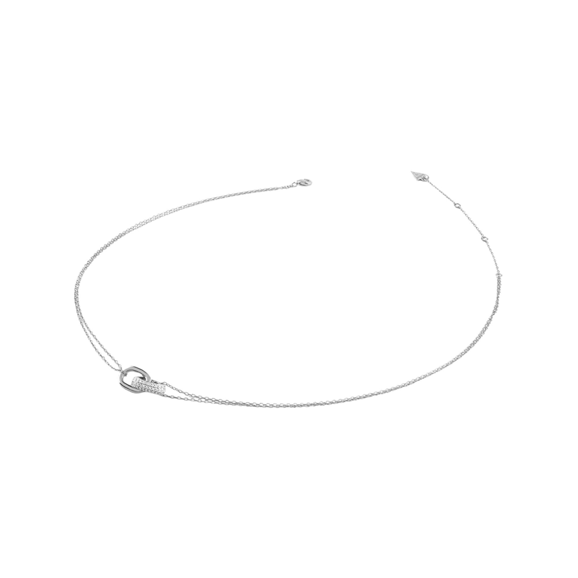 Die Guess Nuances Halskette für Damen ist aus rhodiniertem Silber gefertigt und besticht durch eine feine, elegante Kette mit einem Anhänger aus zwei ineinandergreifenden Gliedern – eines glatt, das andere mit weissen Zirkonia besetzt. Der Verschluss ist durch eine verlängerbare Kette individuell anpassbar.