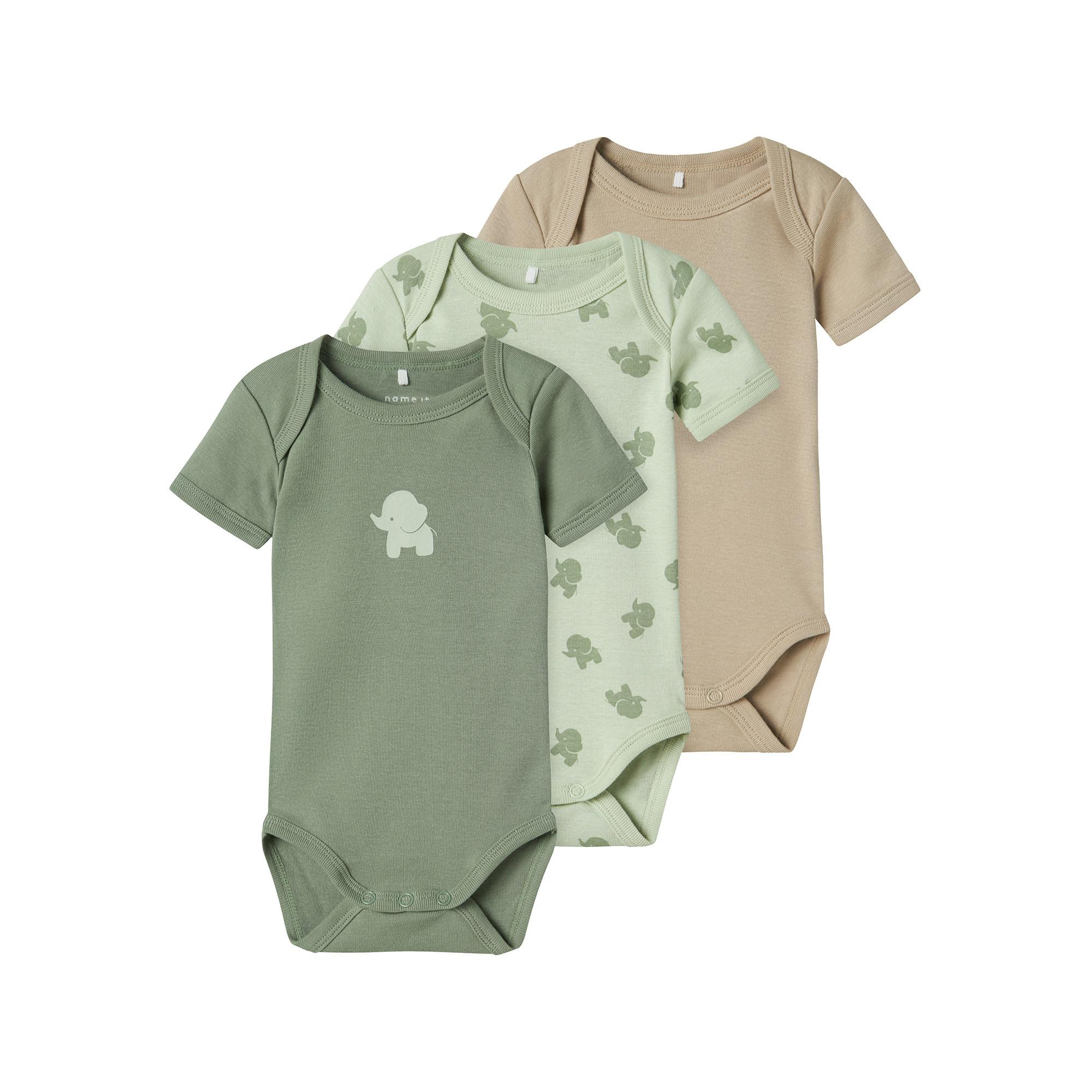 Dieses 3er-Set von Name It aus Baumwolle umfasst Bodys mit Rundhalsausschnitt, darunter ein Modell mit einem Elefantmotiv.