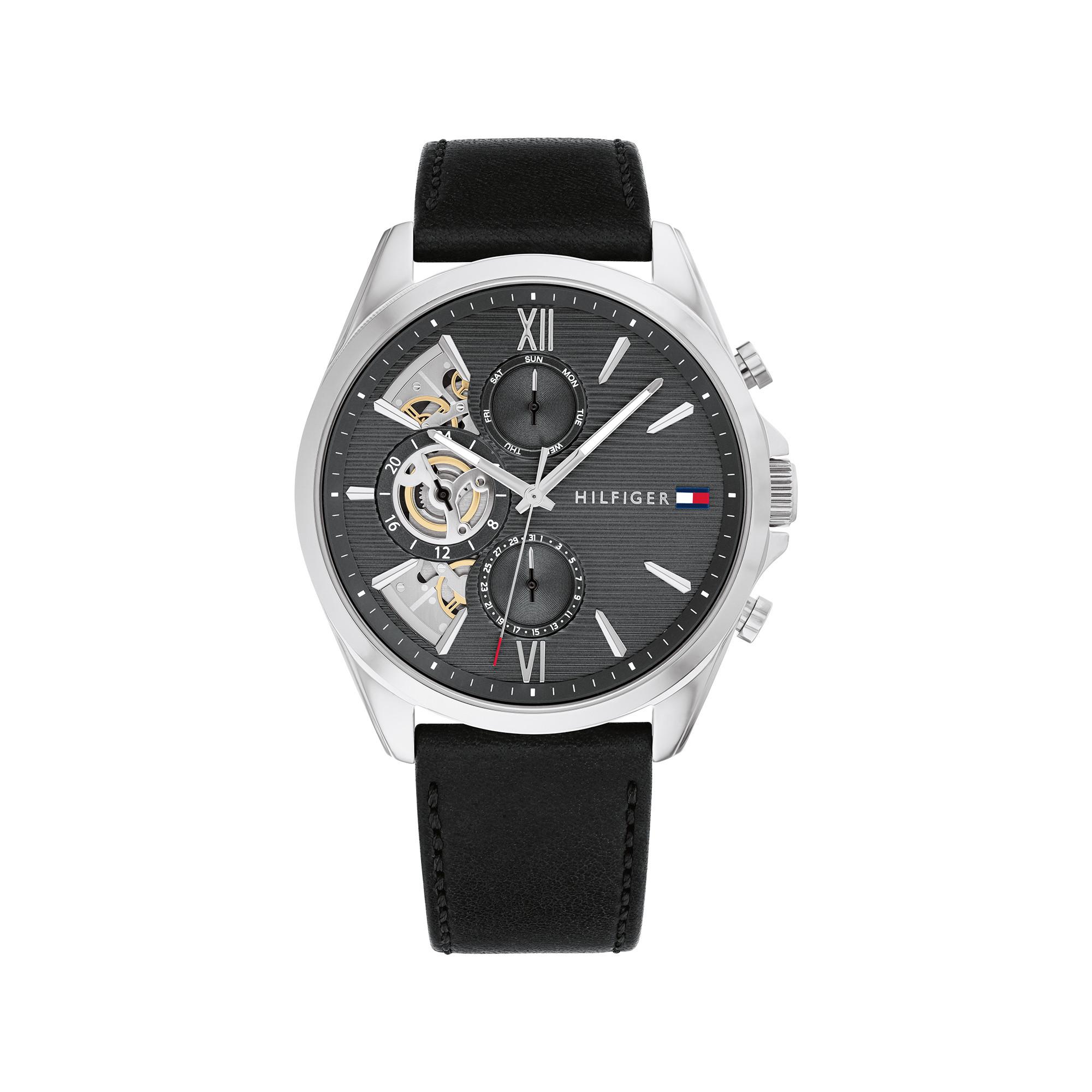 Diese Uhr von Tommy Hilfiger Baker ist eine elegante Zeitmesser für Herren. Sie verfügt über ein rundes Gehäuse aus Edelstahl und ein hochwertiges, schwarzes Lederarmband für hohen Tragekomfort. Der Quarz-Uhrwerk bietet multifunktionale Eigenschaften, während das mineralische Glas und die Wasserdichtigkeit bis 50 m die Alltagstauglichkeit unterstreichen.