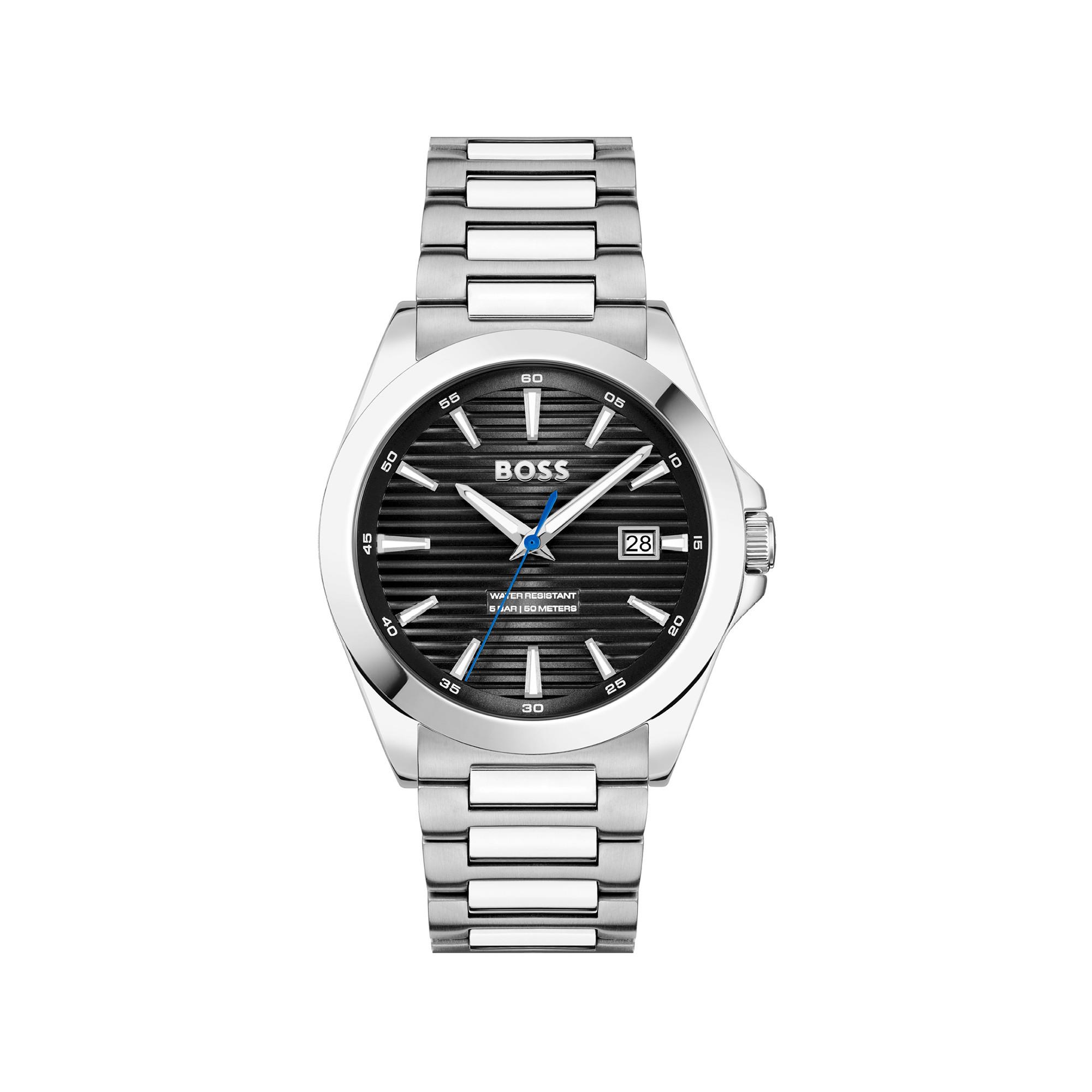 Diese Damenuhr von Boss «Simphony Lee» kombiniert Eleganz und Funktionalität. Das schwarze Ziffernblatt mit einer Datumsanzeige bei 3 Uhr wird von silbernen Indizes und Stunden- sowie Minutenzeigern ergänzt, während der blaue Sekundenzeiger besondere Akzente setzt. Das Edelstahlgehäuse schützt das Ziffernblatt und wird von einem Edelstahlarmband mit Falt-Verschluss ergänzt. Mit einer Wasserdichtigkeit von bis zu 50 Metern und einem Quarzuhrwerk ist diese Uhr eine perfekte Kombination aus Stil und Funktion.