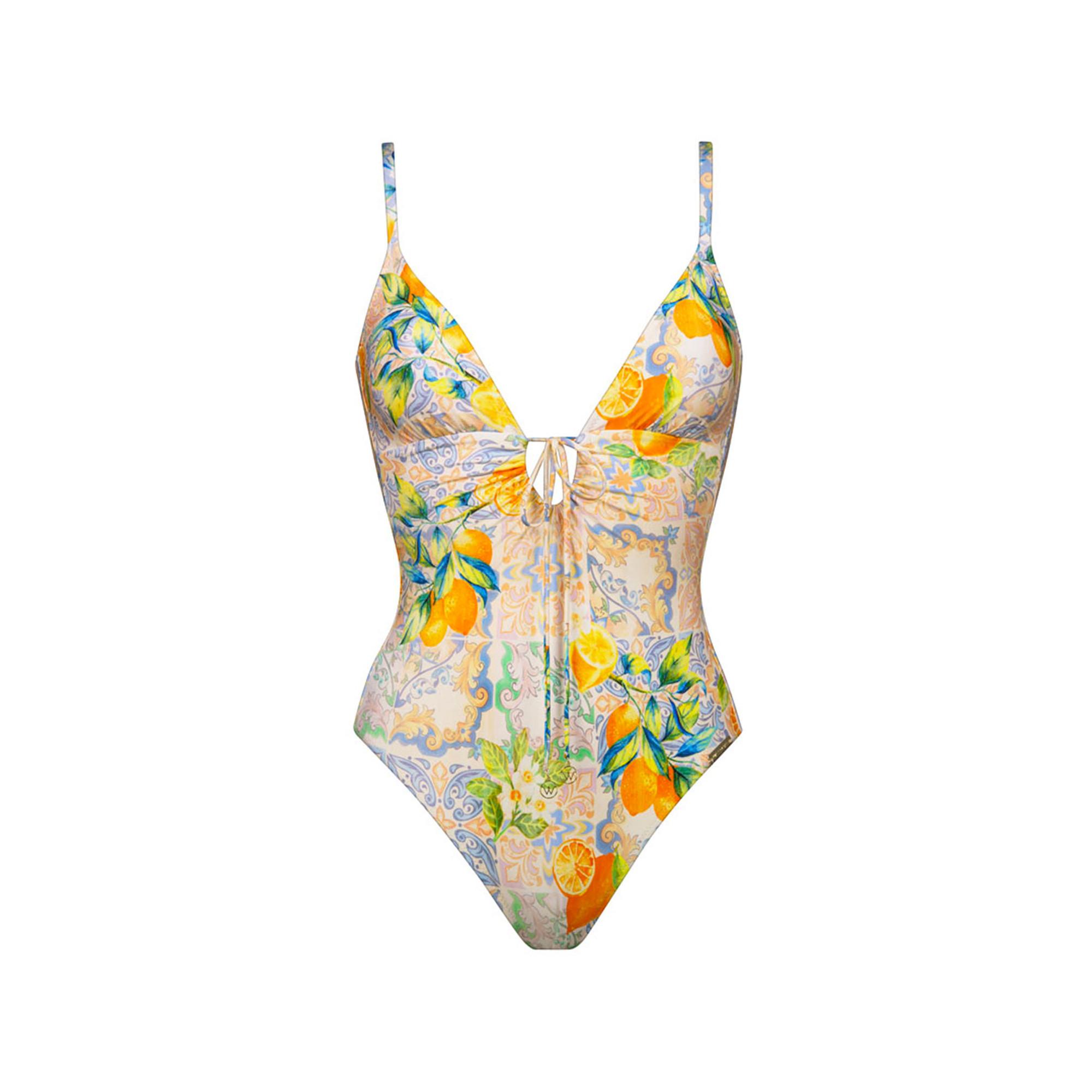 Dieser gemusterte Badeanzug besticht durch sein farbenfrohes Design und den eleganten Schnitt. Er hat eine Schleife vorne und verstellbare Träger, die für eine perfekte Passform sorgen.