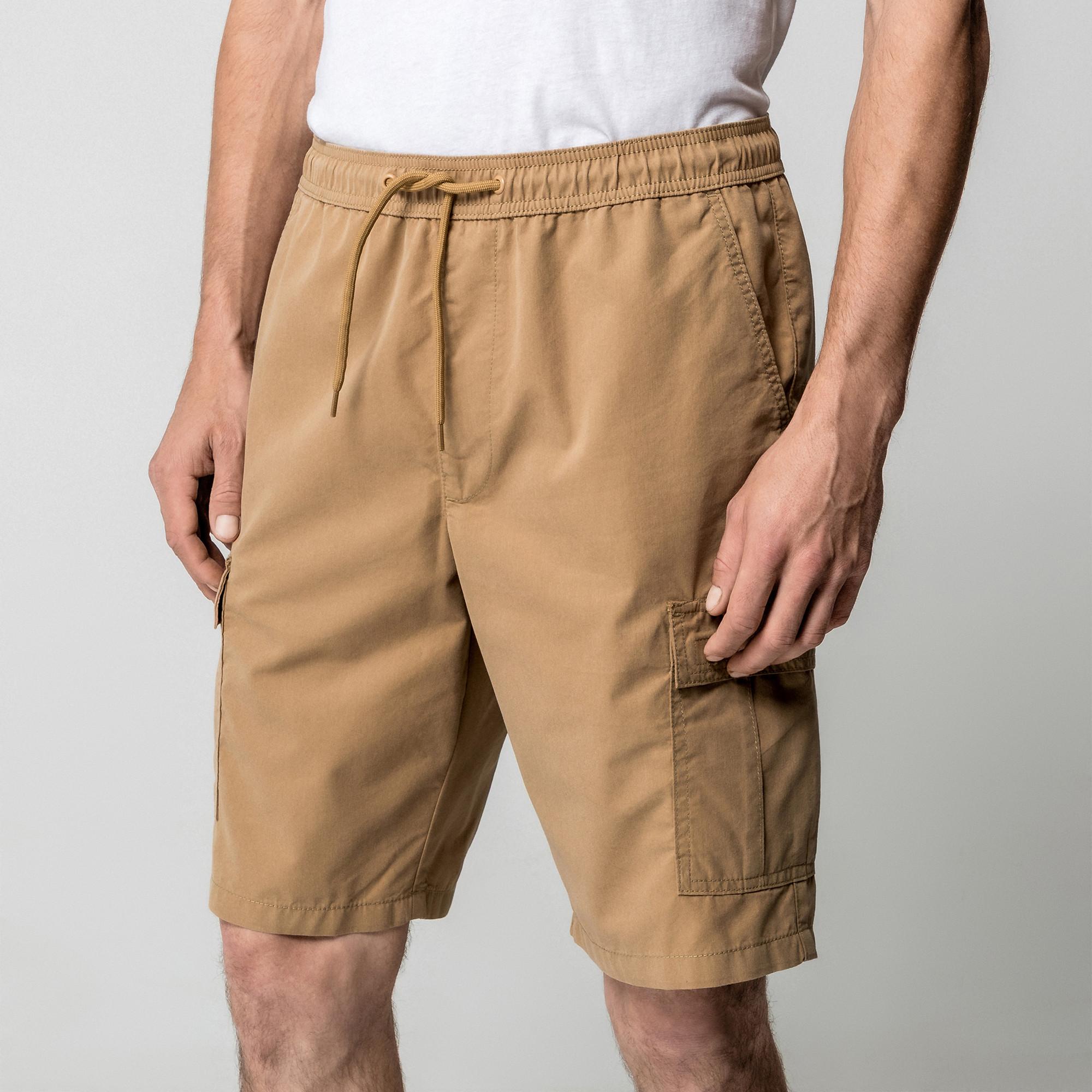 Diese Shorts sind aus bequemem, unifarbenem Twill hergestellt, mit elastischem Bund, Cargotaschen am Bein, schrägen Seitentaschen und einer aufgesetzten Gesässtasche mit Patte und Klettverschluss.