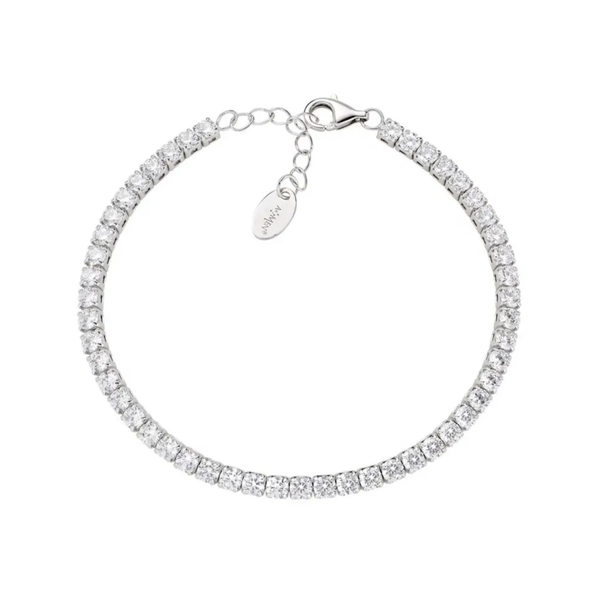 Das Amen Tennis Armband aus 925er Silber ist mit Zirkonia-Steinen verziert und bietet einen sicheren Karabinerverschluss. Die verstellbare Länge von 17 bis 20 cm sorgt für eine individuelle Passform.
