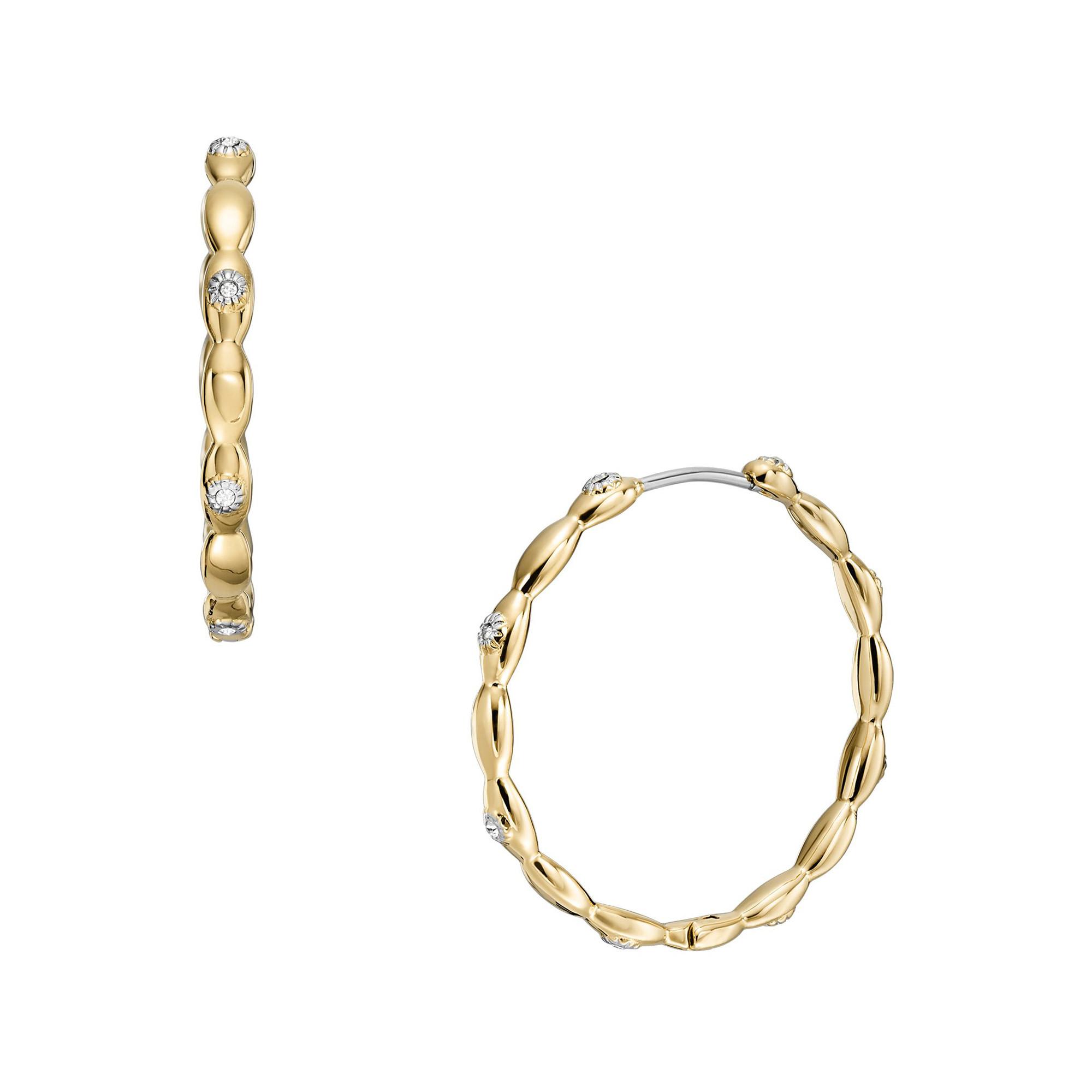 Diese Creolen-Ohrringe von Fossil bestehen aus vergoldetem Edelstahl und sind mit glitzernden Steinchen verziert. Sie bieten einen komfortablen Scharnierverschluss und eignen sich perfekt für den Alltag oder das Kombinieren mit anderen Ohrringen.