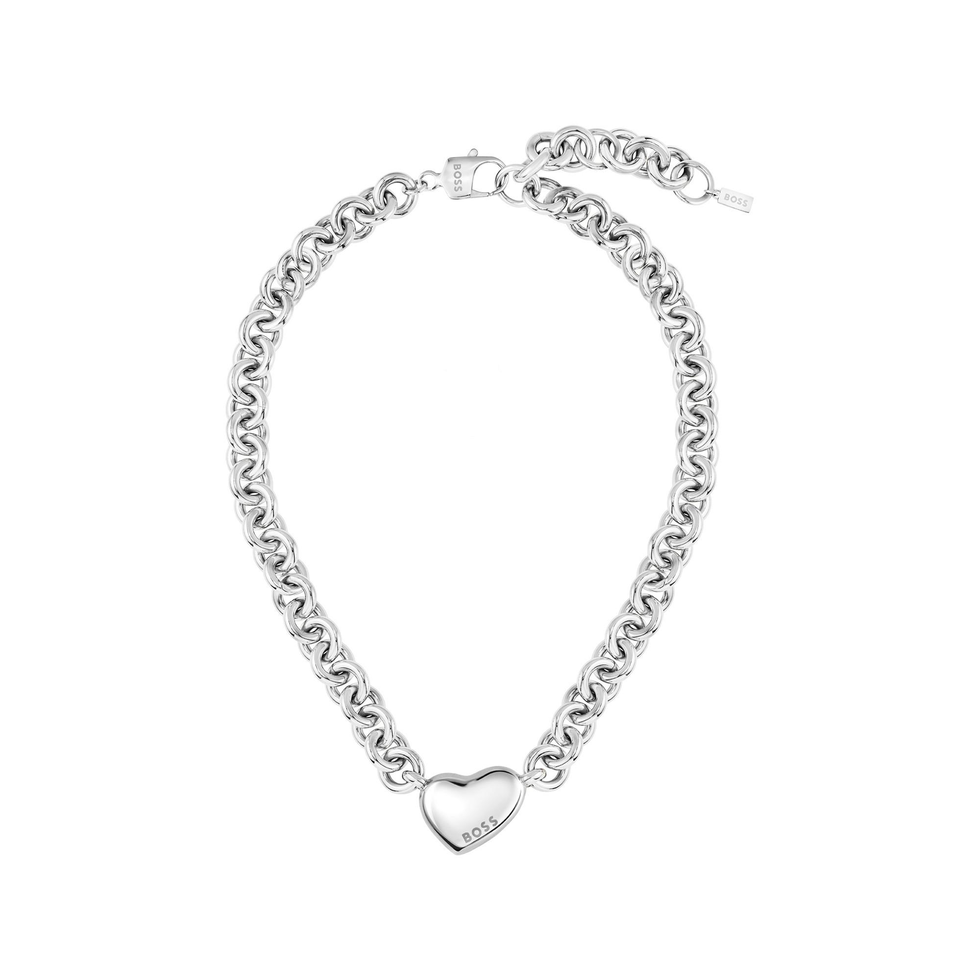 Dieses Collier von Boss für Damen ist aus poliertem Edelstahl gefertigt und besticht durch ein dezentes, herzförmiges Element mit eingraviertem Herstellernamen. Der Karabiner-Verschluss sorgt für Sicherheit und ein einfaches Anlegen.