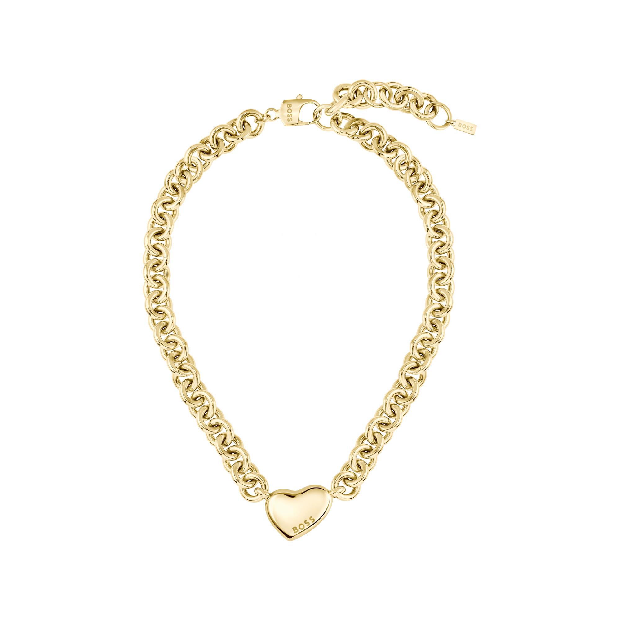 Dieses Collier von Boss für Damen ist aus poliertem Edelstahl gefertigt und besticht durch ein dezentes, herzförmiges Element mit eingraviertem Herstellernamen. Der Karabiner-Verschluss sorgt für Sicherheit und ein einfaches Anlegen.
