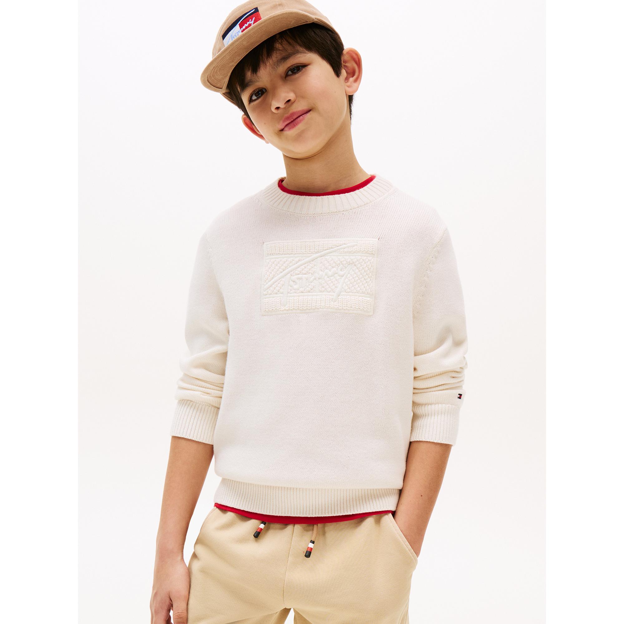 Der „Tommy Script Flag Tonal Sweater“ von Tommy Hilfiger Kids überzeugt mit einem dezenten Logo-Design in zartem Elfenbein-Gelb. Hergestellt aus 100 % regenerativer Baumwolle bietet er ein angenehmes Tragegefühl und steht für nachhaltige Qualität. Ein stilvoller Pullover für jeden Tag.