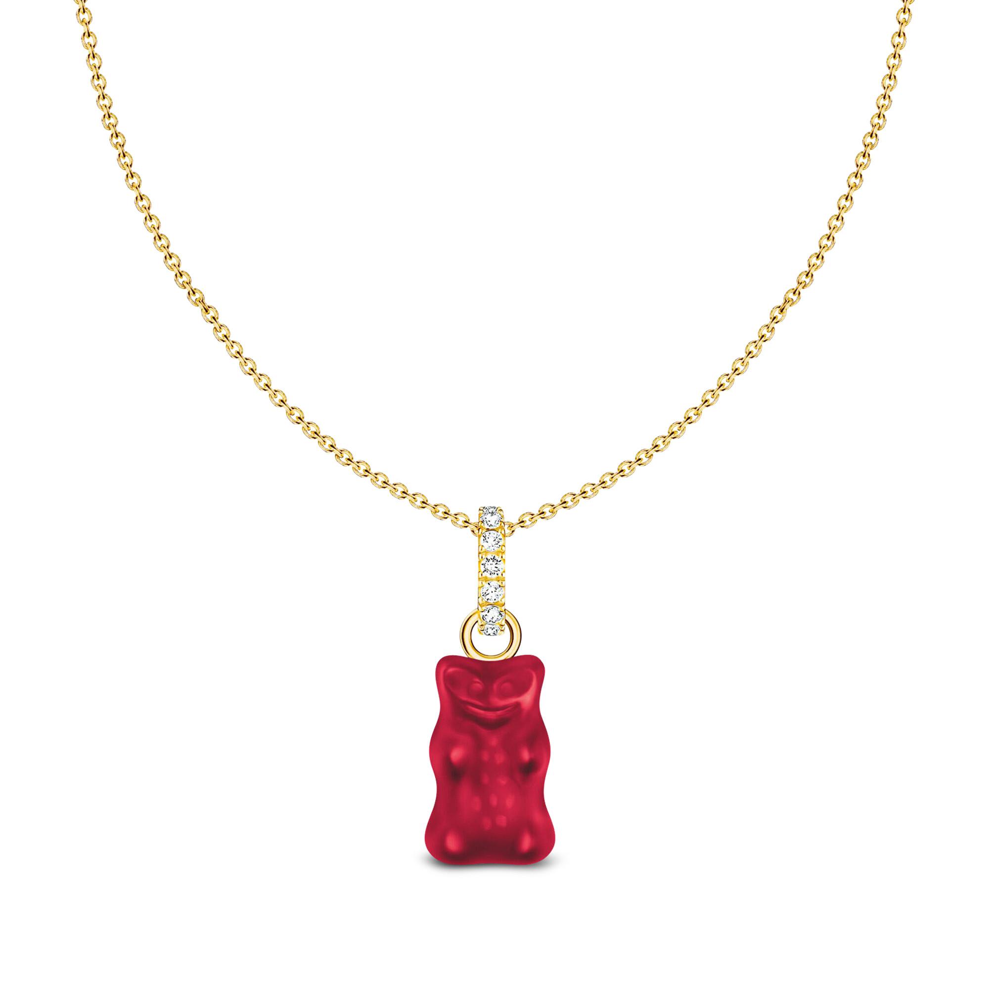 Diese Halskette von Thomas Sabo mit einem Anhänger in Form eines Goldbären aus Kristallglas in Rot wird von weissen Zirkonia-Steinen elegant ergänzt. Der Anhänger sowie die Kette bestehen aus recyceltem Silber und sind mit einer 18k-Vergoldung veredelt.