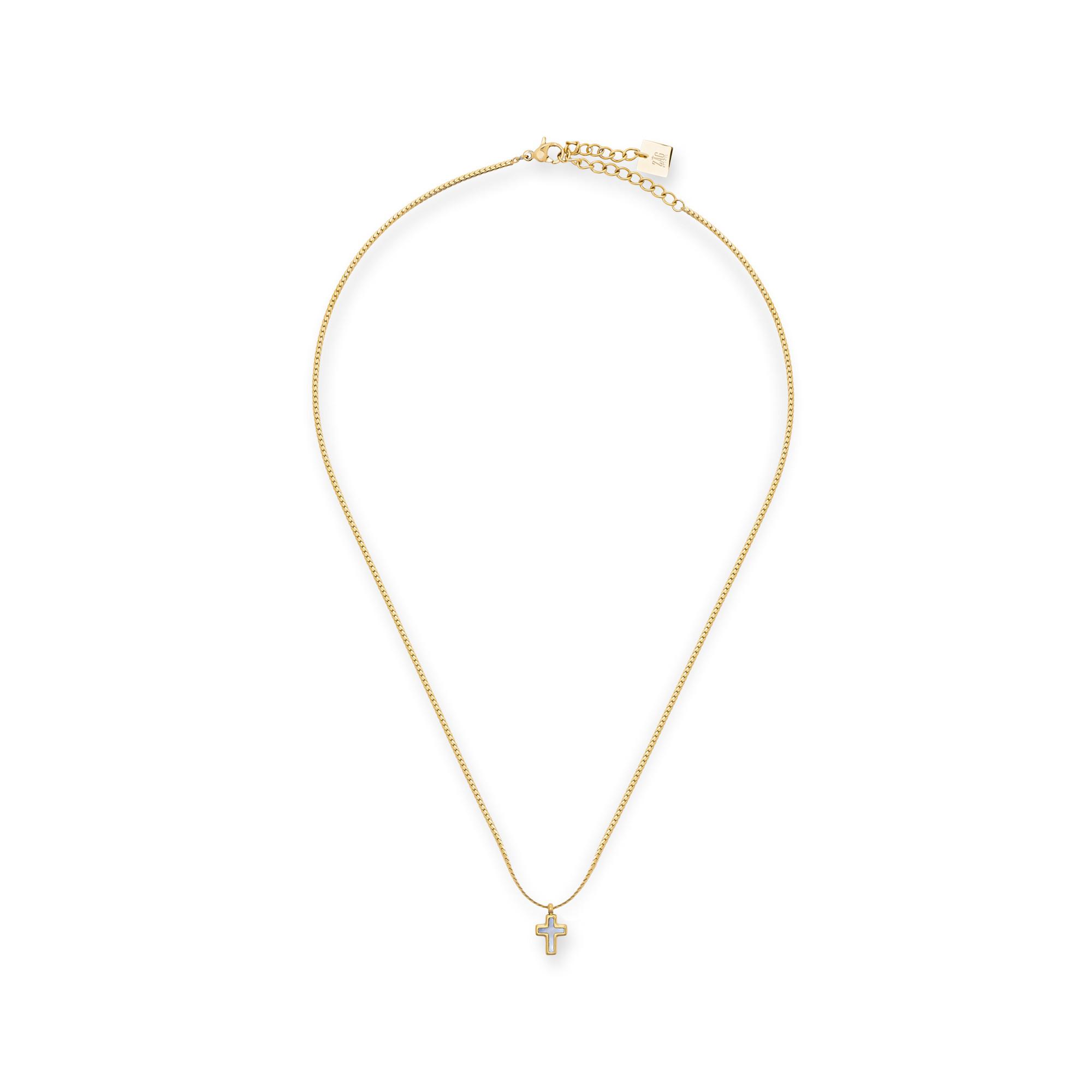 Diese Halskette von Zag Bijoux aus poliertem Edelstahl mit Perlmutt-Kreuz ist ein zartes Schmuckstück mit trendigem Design. Die feminine Kette ist in der Weite anpassbar und hat einen Karabinerverschluss.