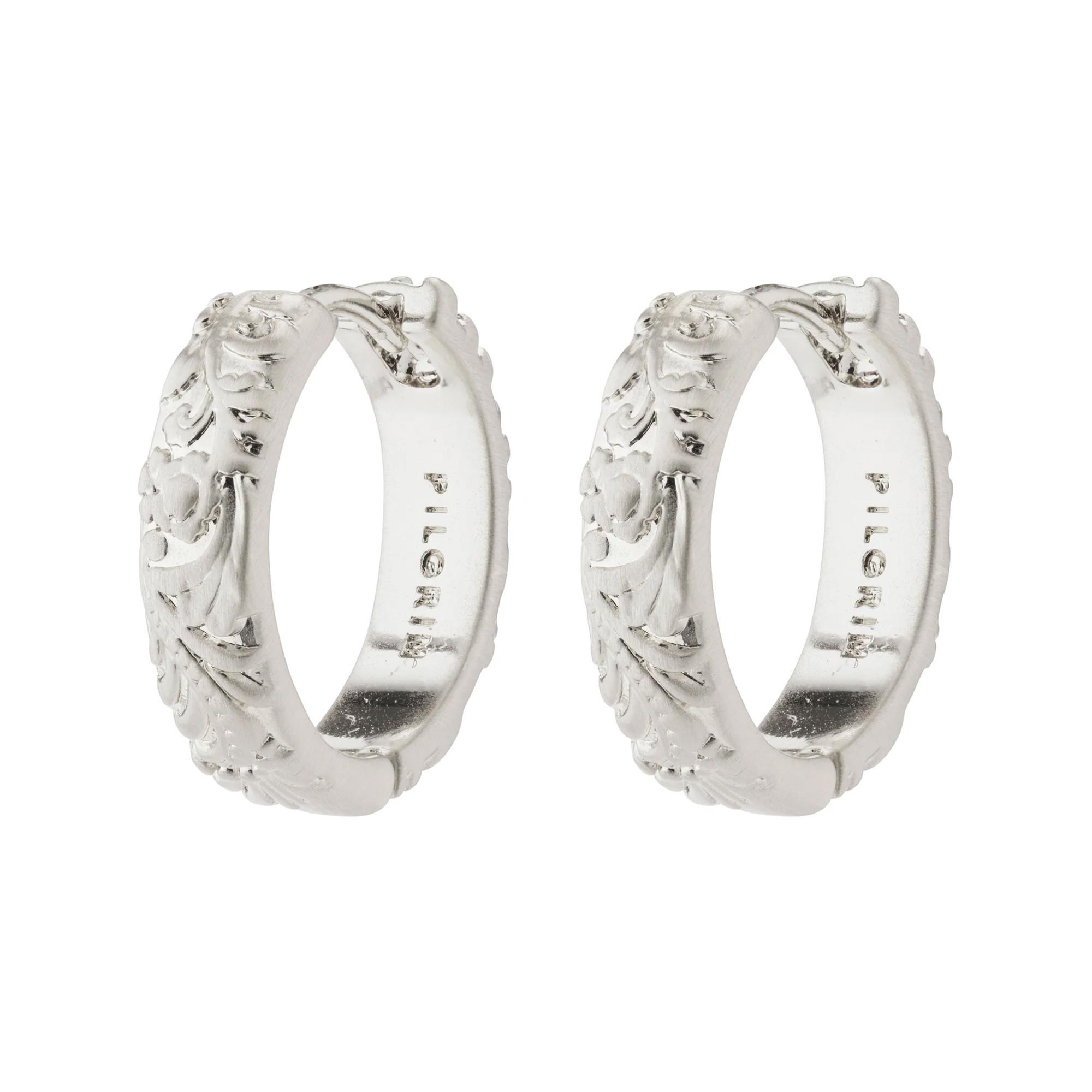 Die versilberten Creolen von Pilgrim sind mit einzigartigen Schnitzereien inspiriert von der Schönheit der Natur gestaltet. Blumen, Blätter und Äste zieren die satin-matte Oberfläche der Creolen. Perfekt für einen sommerlichen, stilvollen Look, lassen sie sich mit luftigen Kleidern, leichten Hemden oder lässigen Leinenhosen kombinieren. Die Ohrringe sind mit einem leicht zu bedienenden Click-Lock ausgestattet und bestehen aus 99 % recycelten Materialien.