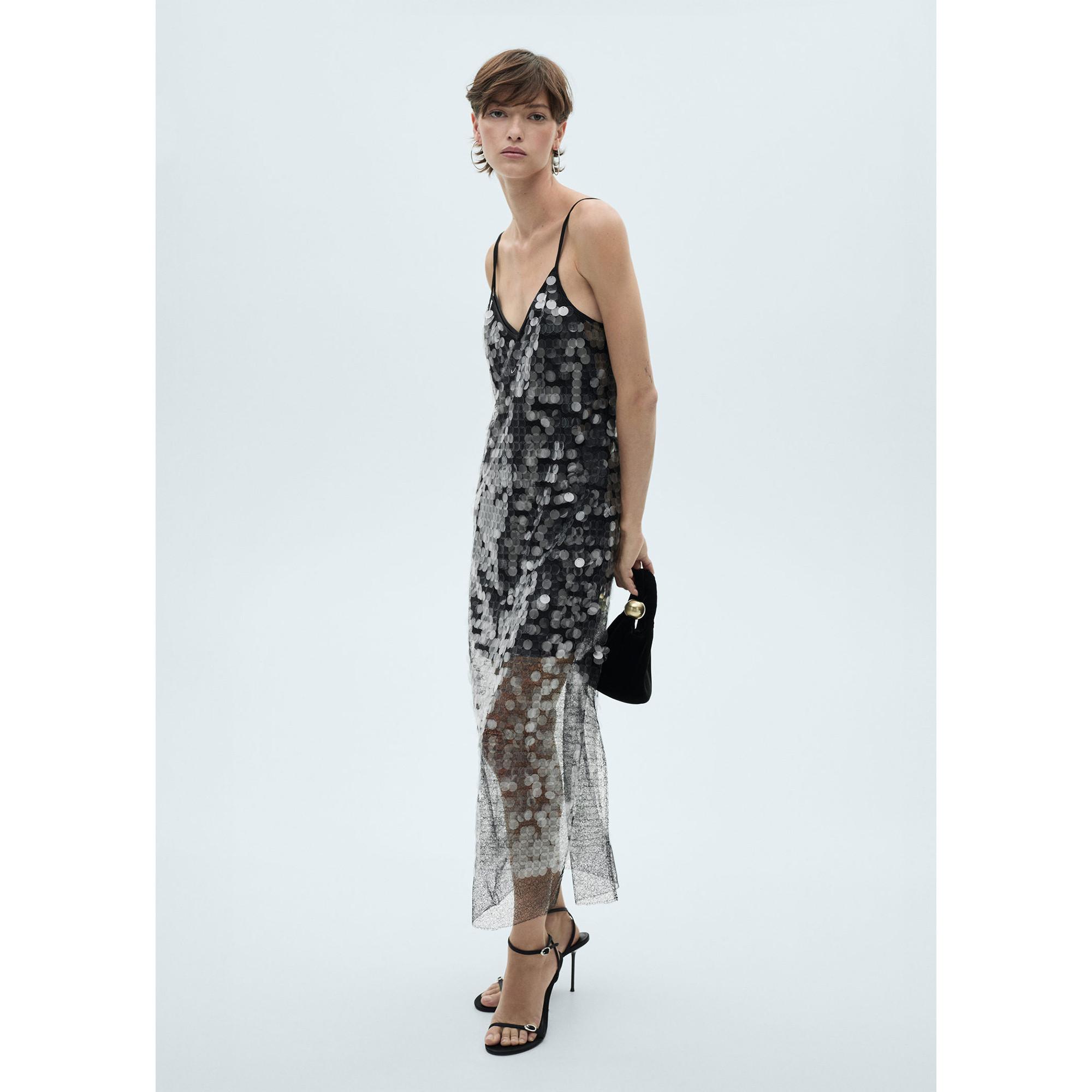 Das transparente Kleid besticht durch seinen leichten Stoff, der mit grossen Pailletten verziert ist. Es verfügt über schmale, verstellbare Spaghettiträger und einen V-Ausschnitt. Ein separates Unterkleid bietet zusätzlichen Komfort und Bedeckung.