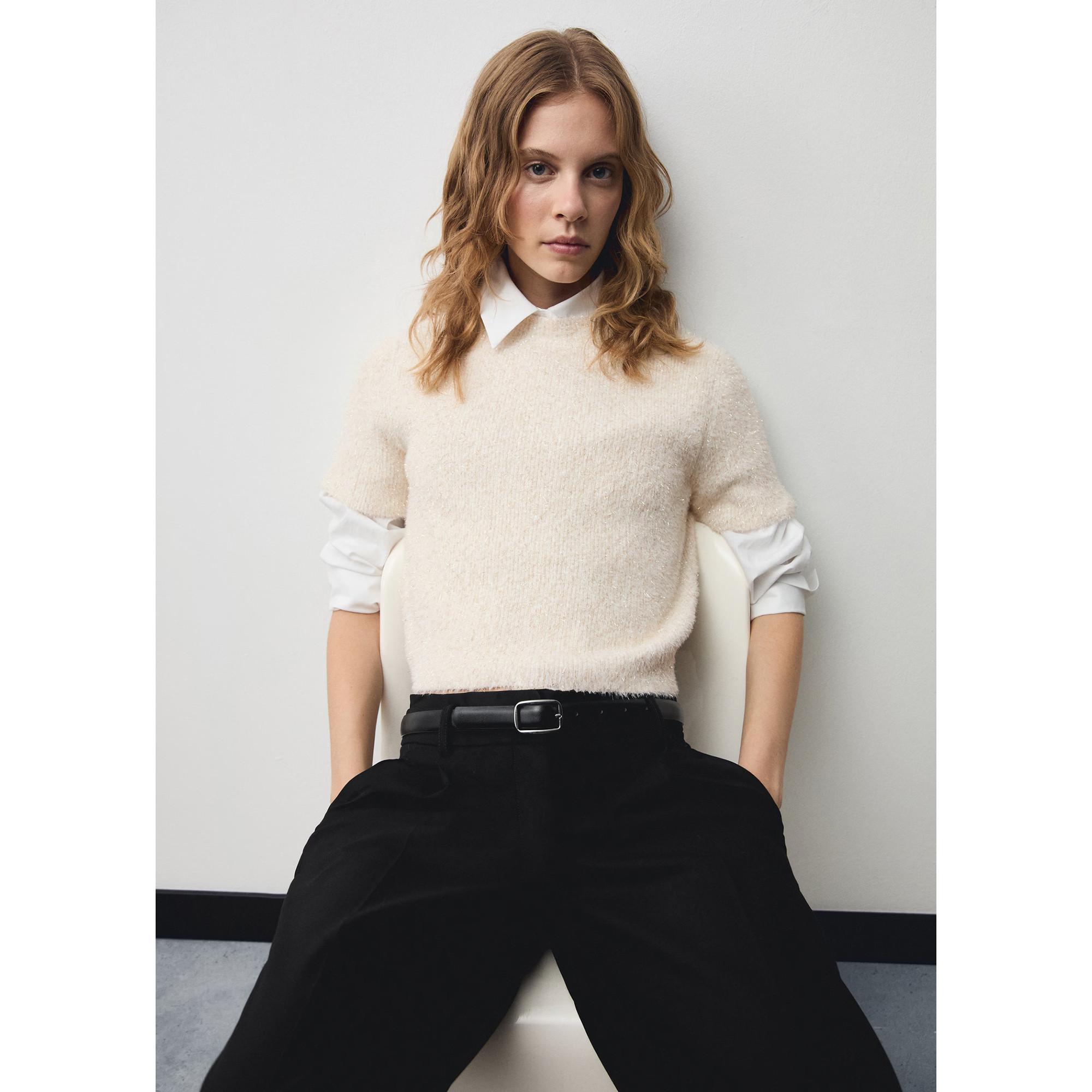 Dieser Pullover überzeugt durch die glänzenden Metallfasern im Strick und das gerade Design. Er verfügt über einen Rundhalsausschnitt und kurze Ärmel. Der Pullover kommt ohne Verschluss aus und bietet einen eleganten Look für verschiedene Anlässe.