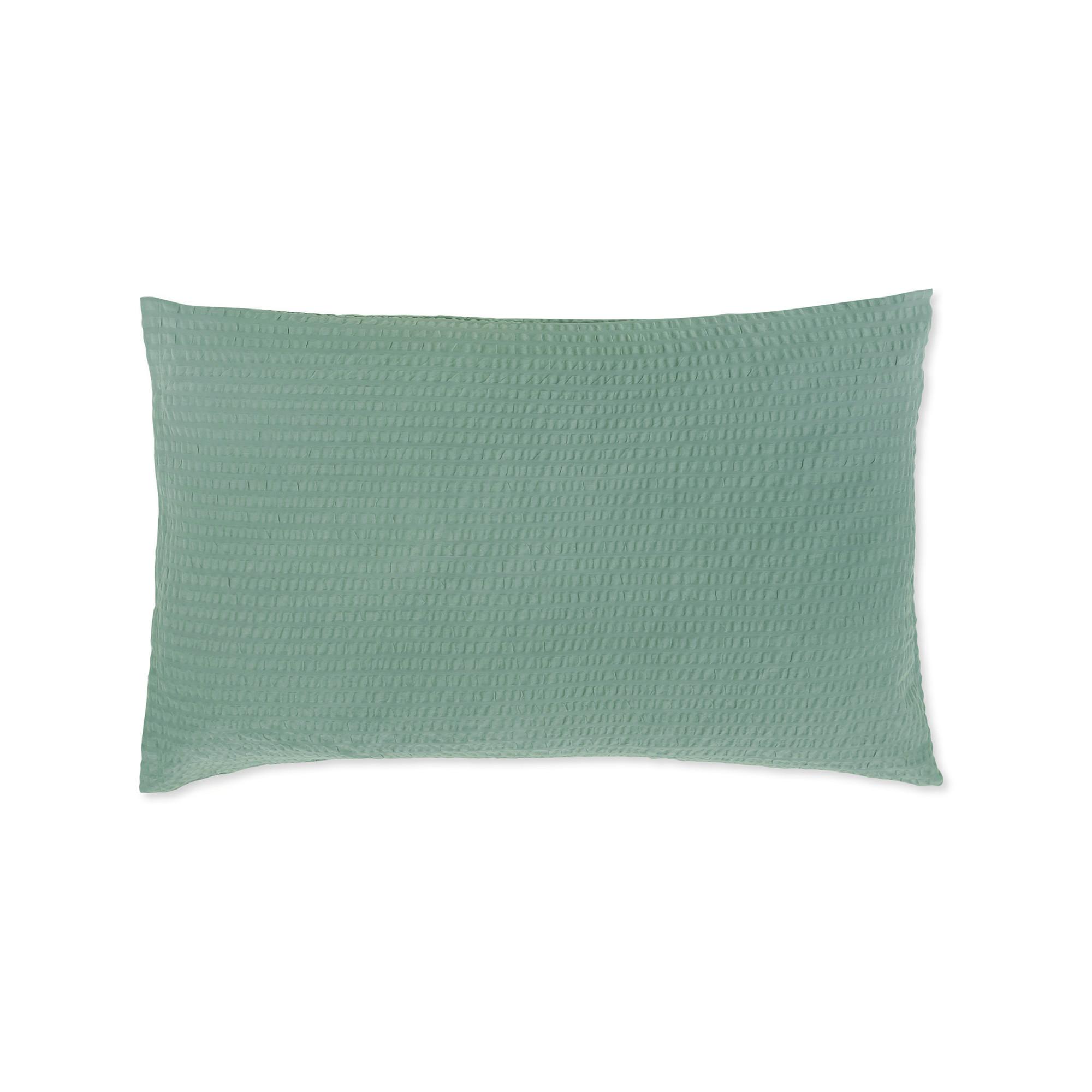 Dieser Kissenbezug ist aus Seersucker hergestellt und weist die klassische Webstruktur auf. Er ist feuchtigkeitsregulierend und speichert Wärme, was ihn zu einer bequemen und stilvollen Ergänzung für jede Bettwäsche macht. Der Bezug hat einen Reissverschluss zum unkomplizierten Wechseln der Bettwäsche.