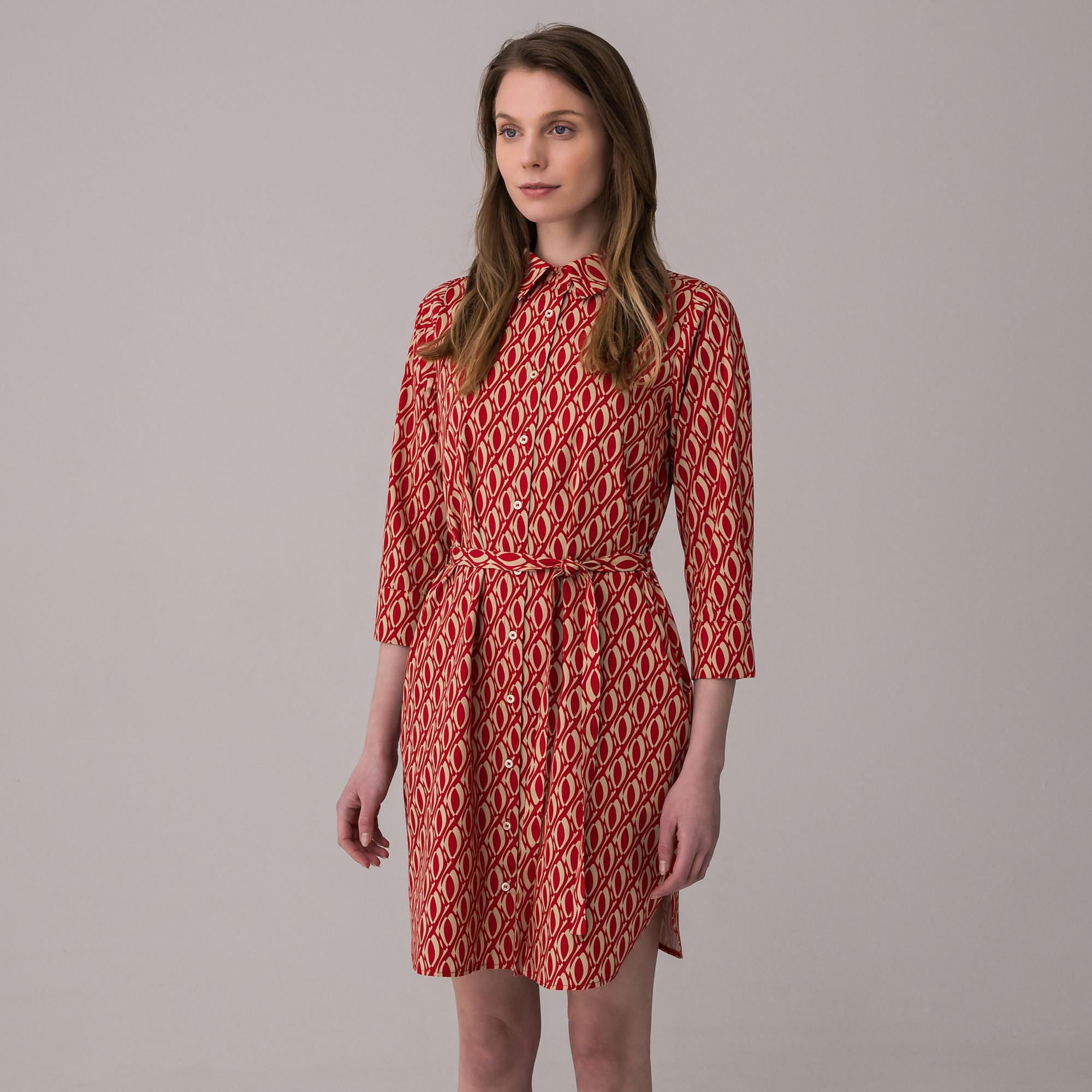 Dieses elegante Midikleid verbindet den angesagten Hemdblusen-Style mit klassischen 60er-Jahre-Features und -Print. Haifisch-Kragen, schmale 7/8-Ärmel und der gerade Schnitt, der durch den Bindegürtel tailliert wird, definieren den eigenwilligen Charakter.