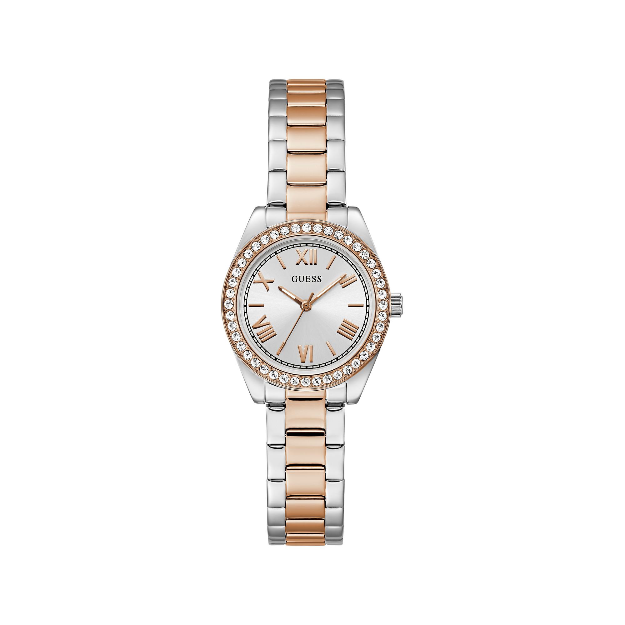 Die Guess Mini Luna Damenuhr vereint raffinierte Eleganz mit modernen Akzenten und einem luxuriösen Charme. Das silberfarbene Edelstahlgehäuse mit einer Lünette in Roségold und weissen Zirkoniasteinen sowie das bicolor Edelstahlarmband machen sie zu einem stilvollen Accessoire. Mit einem präzisen Quarzwerk und einer Wasserdichtigkeit von 3 ATM ist sie sowohl für elegante Anlässe als auch für den täglichen Gebrauch geeignet.