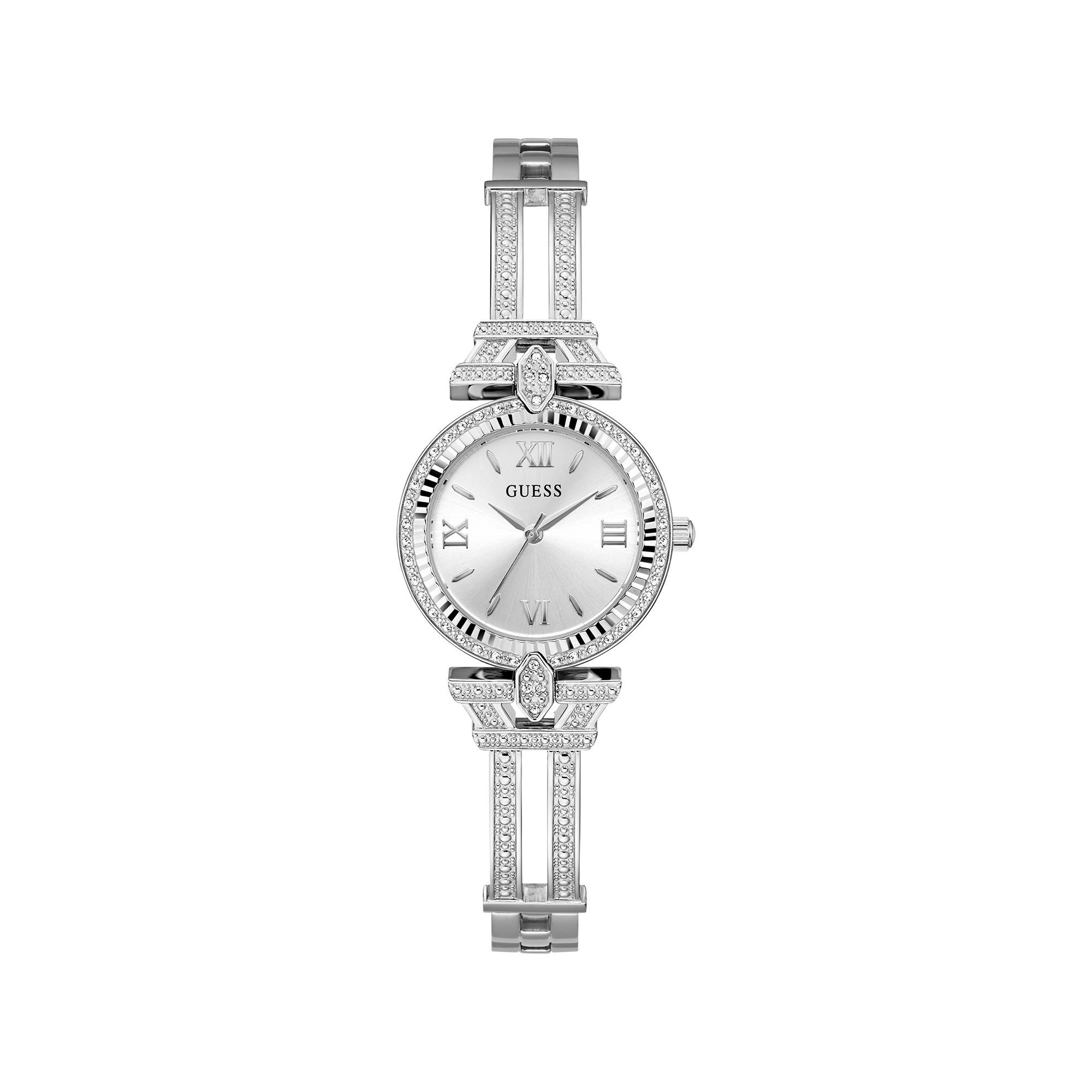 Die Guess Delphine Damenuhr vereint glänzenden Edelstahl und funkelnde Zirkonien zu einem schimmernden Schmuckstück. Mit einem Durchmesser von 28 mm und einem silberfarbenen Armband strahlt sie unvergleichliche Eleganz aus. Das puristische Zifferblatt mit römischen Ziffern und die präzise Quarztechnologie machen sie zu einem zeitlosen und zuverlässigen Begleiter.