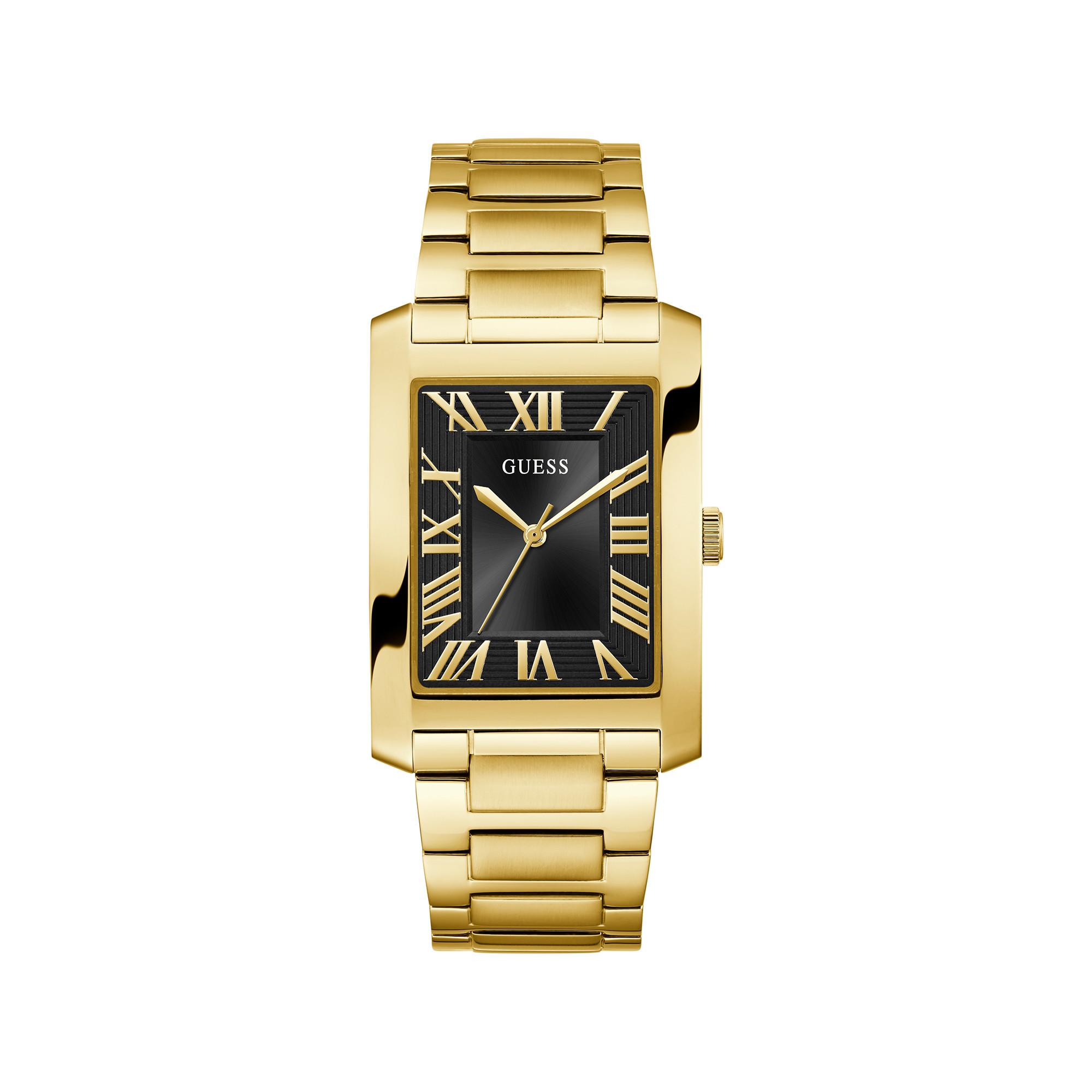 Die rechteckige Herrenuhr von Guess im klassischen Tank-Stil vereint ein schwarzes Zifferblatt mit römischen Zahlen und einem eleganten Edelstahlband in Goldoptik. Ihr poliertes Gehäuse aus recyceltem Edelstahl und die stilvolle Pilotenschliesse machen sie zum zeitlosen Begleiter.