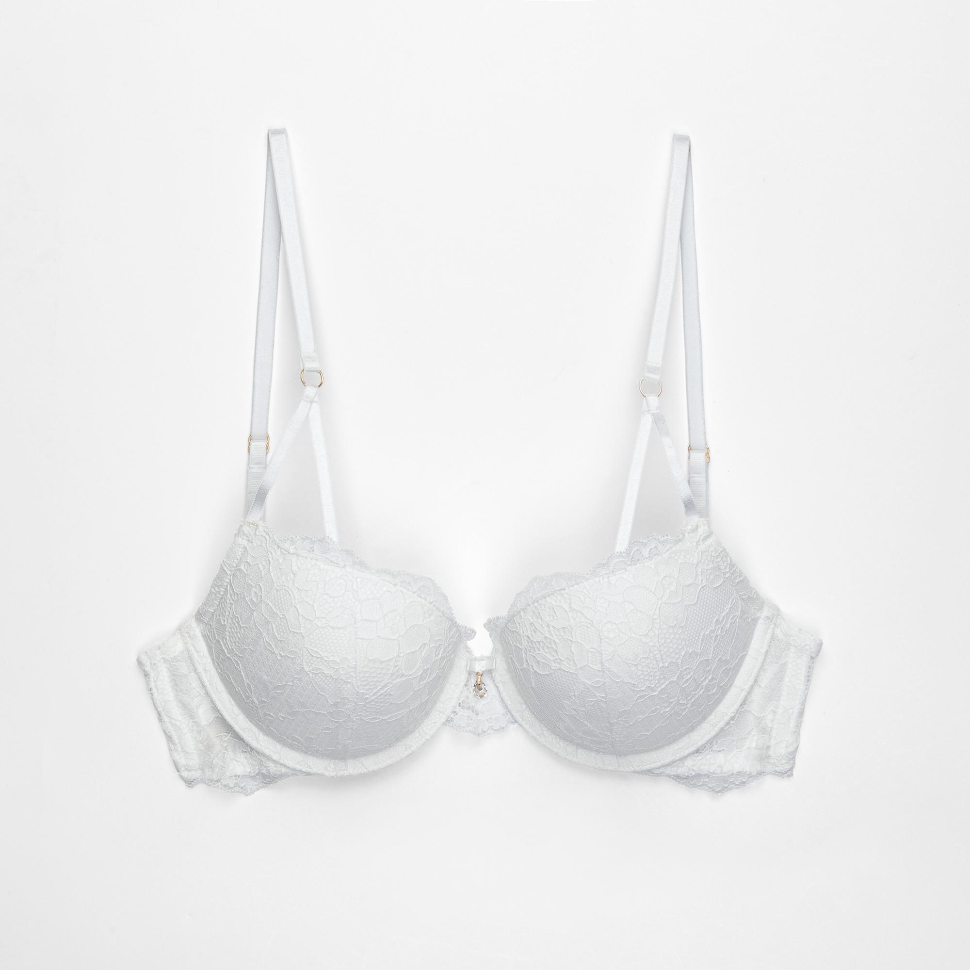 Dieser Push-up-BH verfügt über zarte Spitzendetails, die sowohl Eleganz als auch Halt bieten. Das Design umfasst verstellbare Träger und einen Hakenverschluss für eine bequeme und anpassbare Passform. Ein kleiner dekorativer Anhänger in der Mitte verleiht einen subtilen Hauch von Raffinesse.