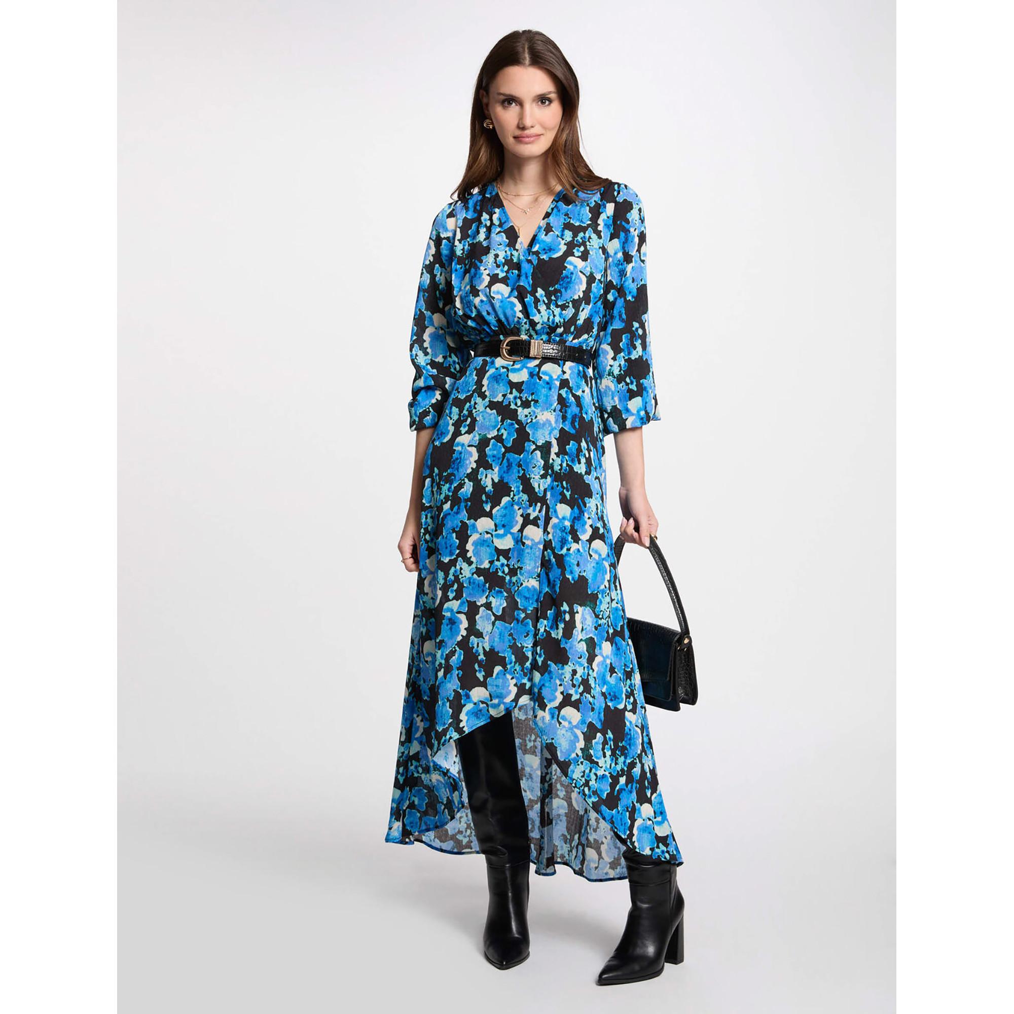 Dieses lange, figurbetonte Kleid von Morgan verfügt über einen Wickelausschnitt und 3/4-Ärmel. Es zeigt ein abstraktes Muster, einen seitlichen Schlitz am unteren Teil und einen asymmetrischen Saum. Dies schafft einen eleganten und fliessenden Look.