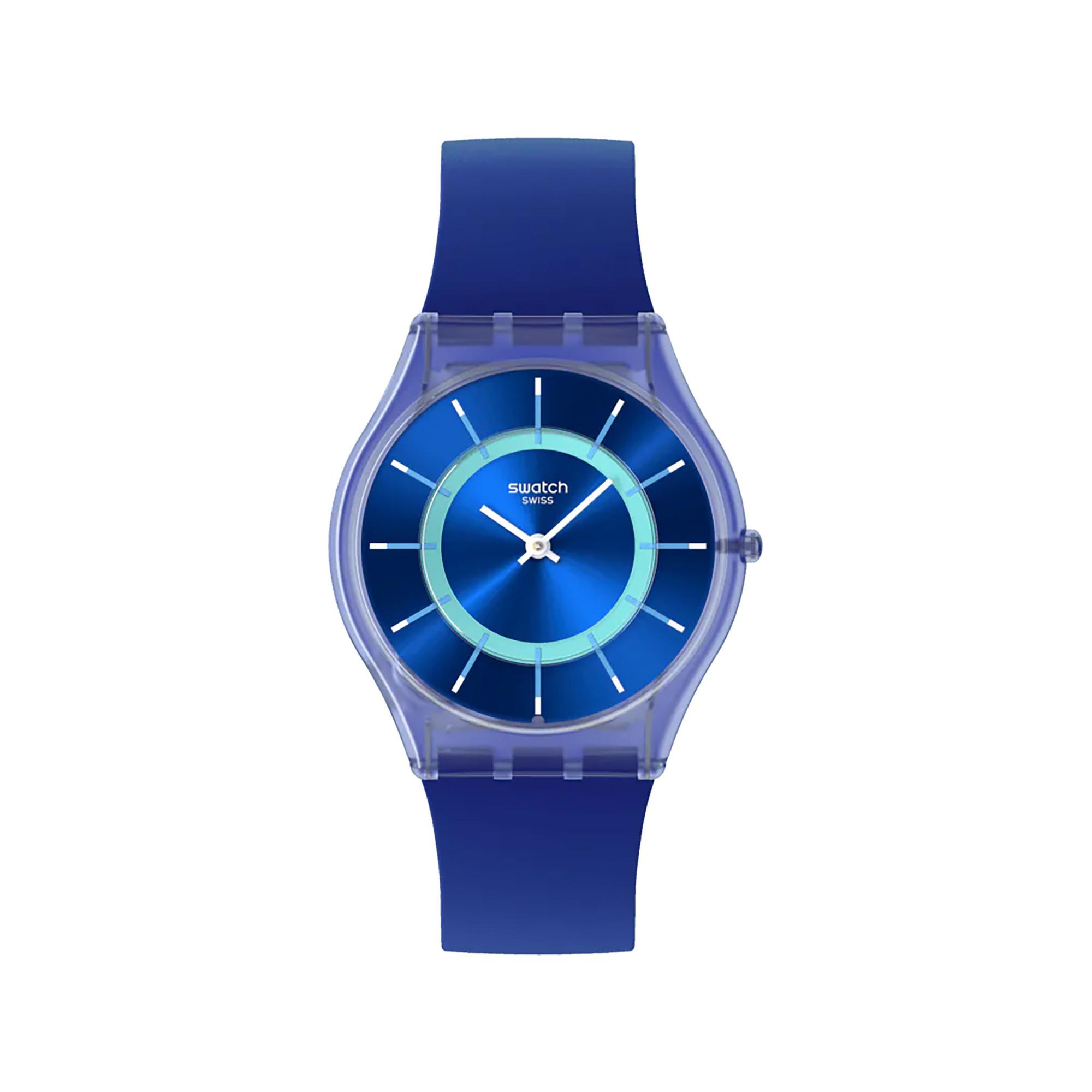 Diese ultraschmale Uhr überzeugt mit ihrem Zifferblatt mit Sonnenschliff. Darauf sieht man einen türkisen inneren Ring, zweifarbige Stundenmarkierungen in Hellblau und Weiss sowie weisse Stunden- und Minutenzeiger. All dies wird geschützt von biobasiertem Glas. Das transparente Gehäuse in mattem Hellblau besteht aus biobasiertem Glas und trifft auf ein Armband mit Farbverlauf von mattem Dunkelblau zu Türkis. Schliesse und Schlaufe sind in mattem, transparenten Türkis gehalten.