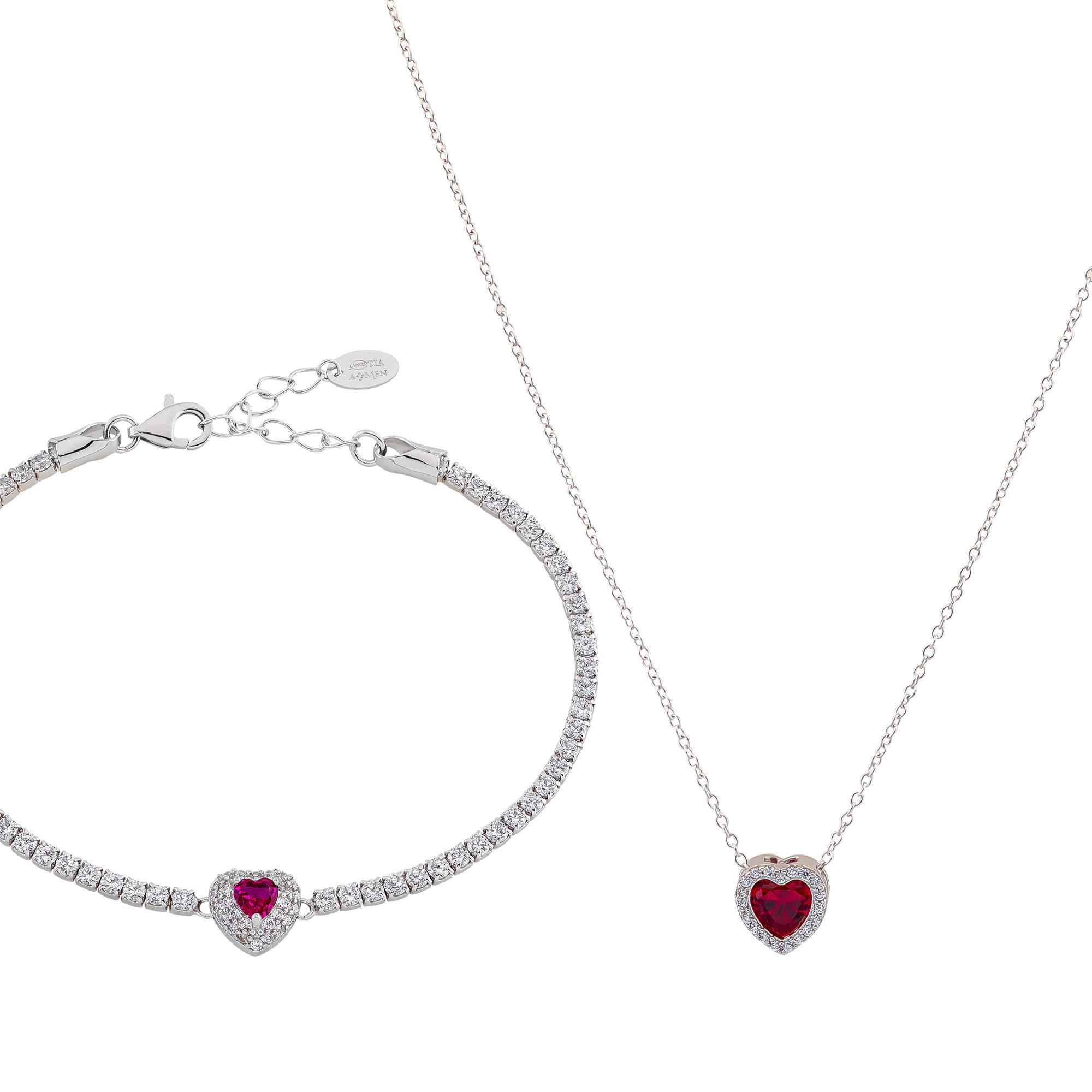 Dieses Schmuckset von Amen besteht aus einem Armkettchen und einer Halskette mit Herz-Anhängern. Beides ist aus Sterling-Silber hergestellt mit facettierten Schmucksteinen. Kette und Armband sind längenverstellbar und lassen sich per Karabiner schliessen.