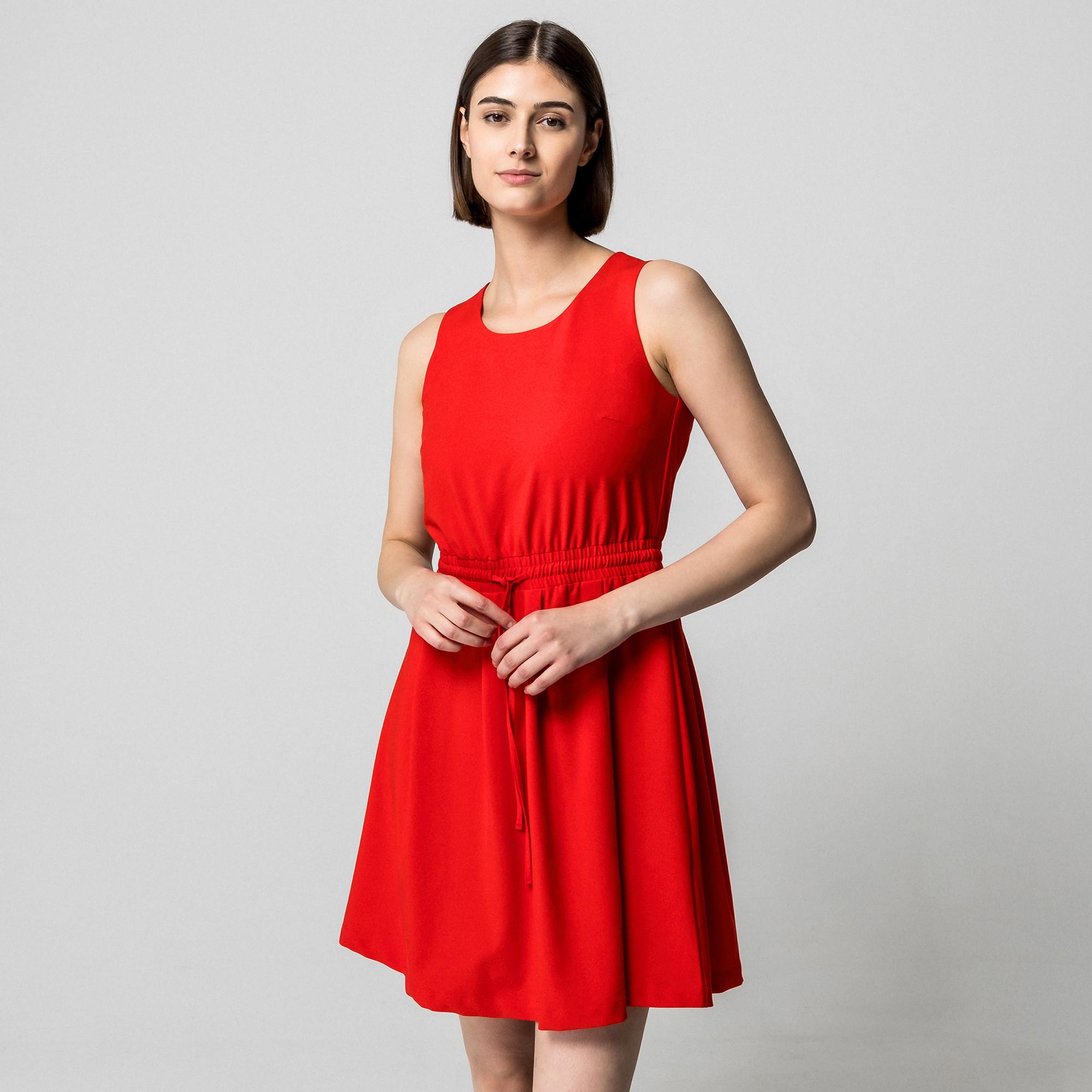Dieses Minikleid mit sportlichem Schnitt und femininer Silhouette ist ein Basic. Das Kleid ist ärmellos und hat eine breite, elastische Taille mit Nahtfalten und Tunnelzug.