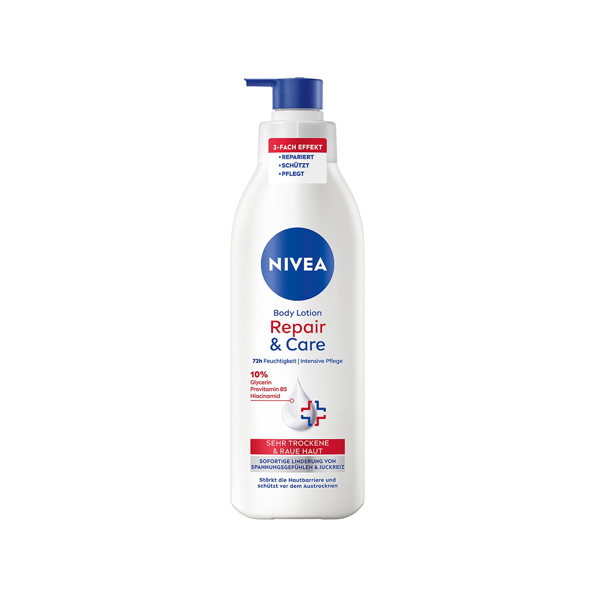 Die NIVEA Repair & Care Body Lotion mit Pumpspender stärkt die Hautbarriere und schützt sie vor dem Austrocknen. Mit ihrer 3-fach Wirkung - repariert, schützt und pflegt - bietet sie die Pflege, die deine Haut braucht. Die Lotion enthält einen 10%igen Komplex aus Glycerin, Provitamin B5 und Niacinamid, der juckendes Hautgefühl sofort beruhigt und für ein gesundes Aussehen sorgt. Zudem ist die Creme durch den Pumpspender einfach zu entnehmen. Die NIVEA Repair & Care Body Lotion ist ideal für trockene und sehr trockene Haut, da sie 72 Stunden Feuchtigkeit spendet. Nicht fettend und schnell einziehend.