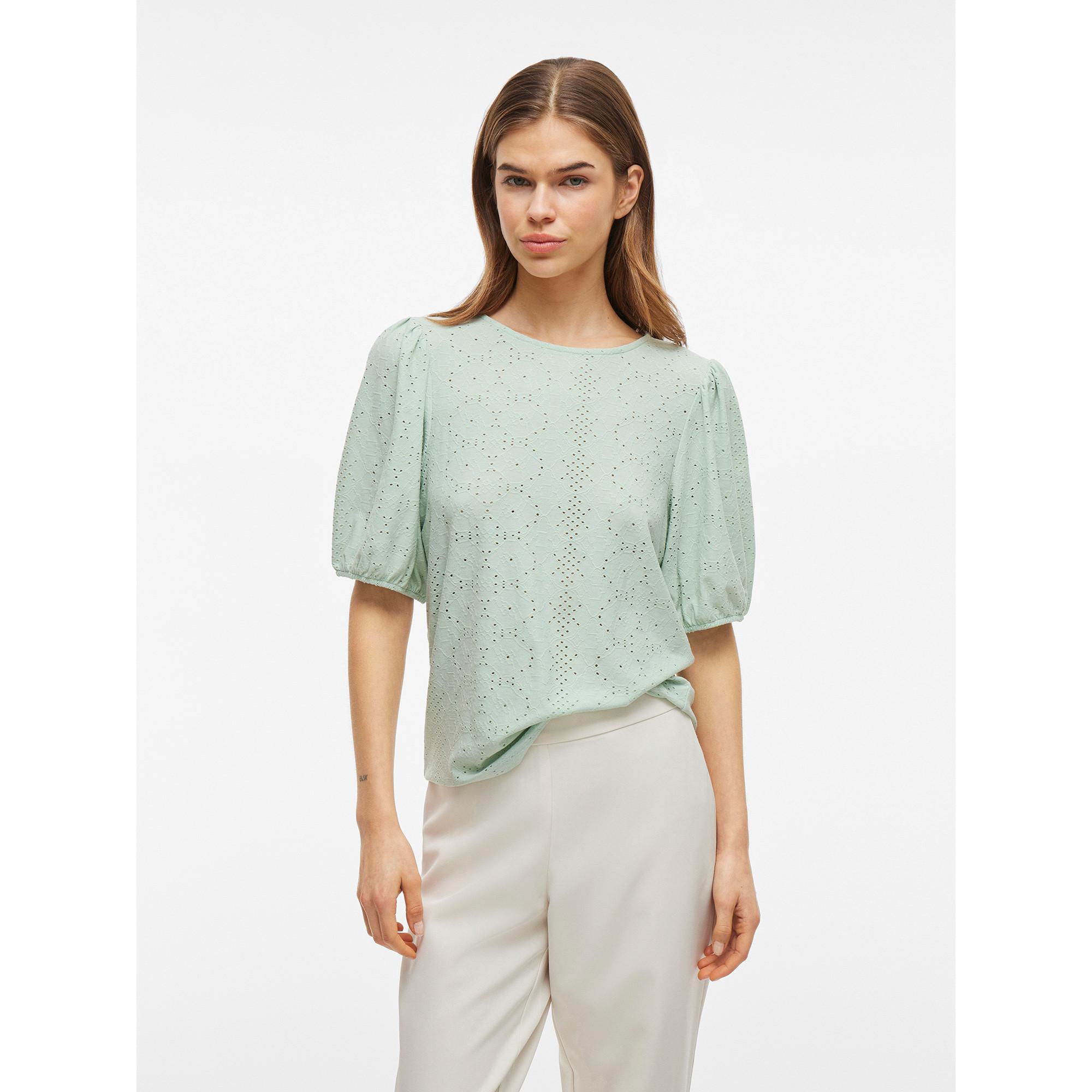 Das Oberteil zeichnet sich durch einen Rundhalsausschnitt mit Knopf am Rücken sowie kurze Puffärmel aus. Der schöne Stoff mit Lochmusterung und der Regular Fit sorgen für einen stilvollen und bequemen Look. Es ist ideal für verschiedene Anlässe und vielseitig kombinierbar.
