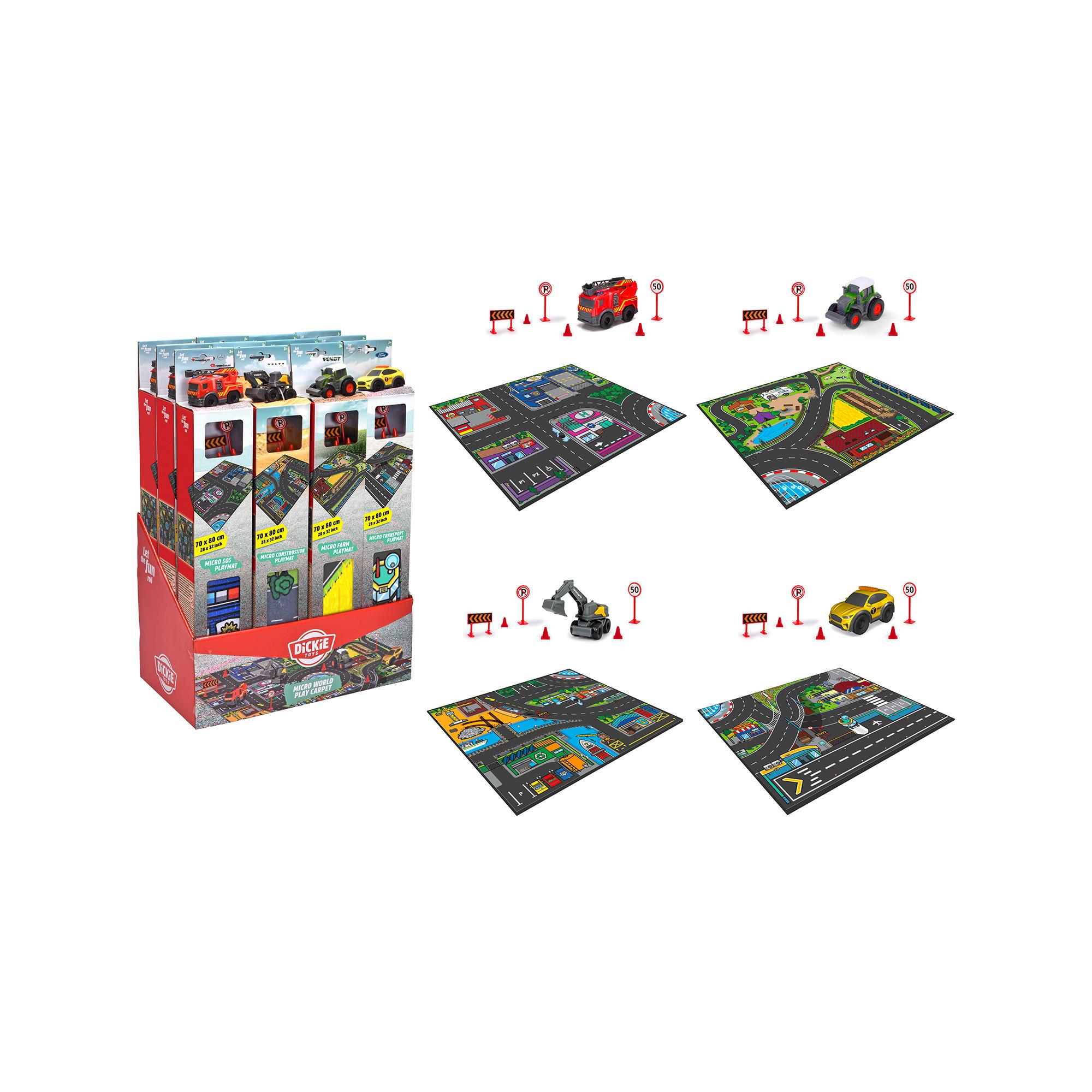 Spielteppich 70 x 80 cm mit Antirutschbeschichtung, 1 Micro Fahrzeug mit Freilauf und Verkehrs- schilder,12 Stk./Display je 3x Farm, SOS, Baustelle, Transport