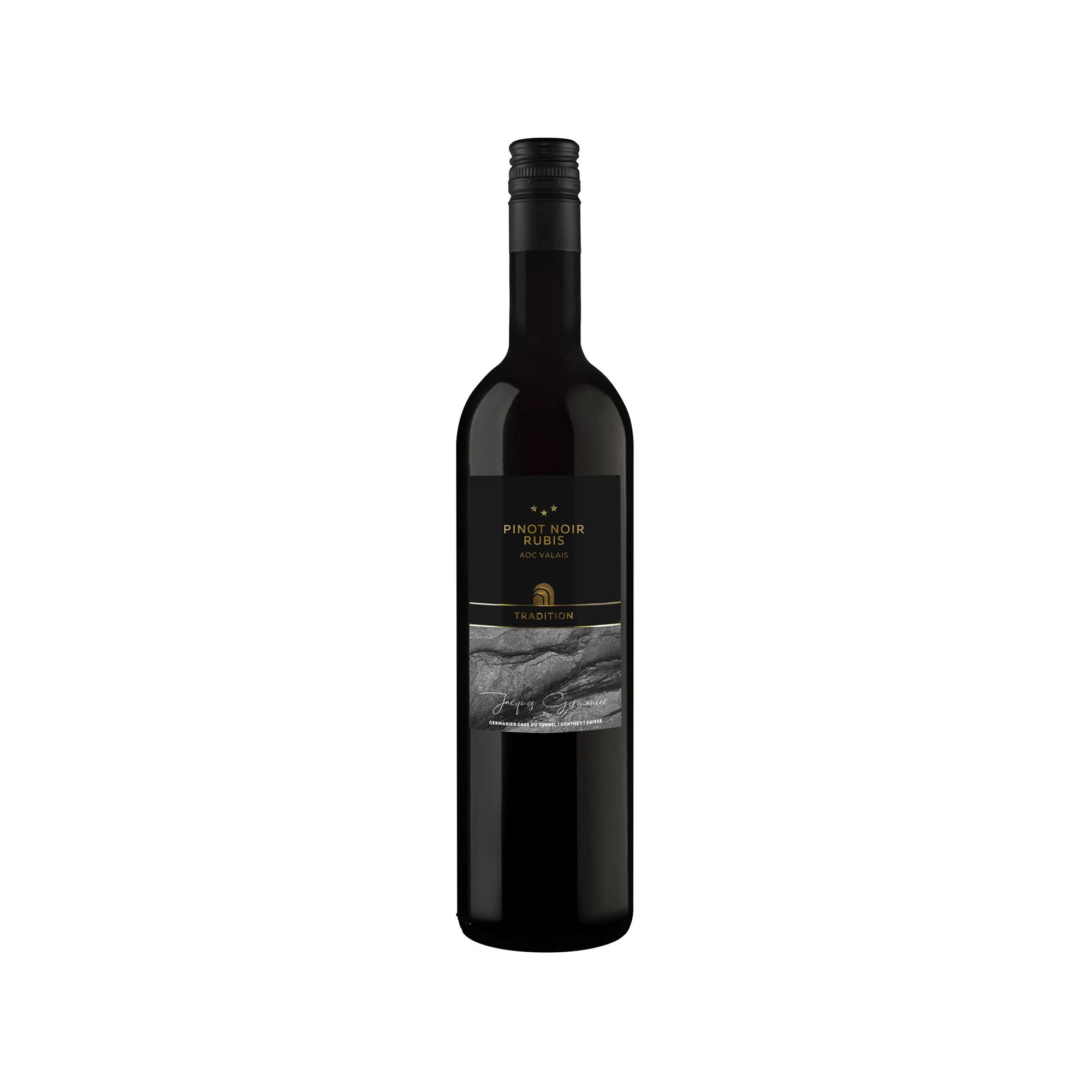 Der J. Germanier Pinot Noir wird im Weingut Germanier - Cave du Tunnel im Wallis hergestellt. Dieser Wein, der aus dem französischen Pinot Noir stammt, wurde vom Staatsrat eingeführt, um den Weinsektor zu beleben. Er ist die am häufigsten angebaute Rebsorte im Wallis und trotzt problemlos Trockenheit und Kälte.