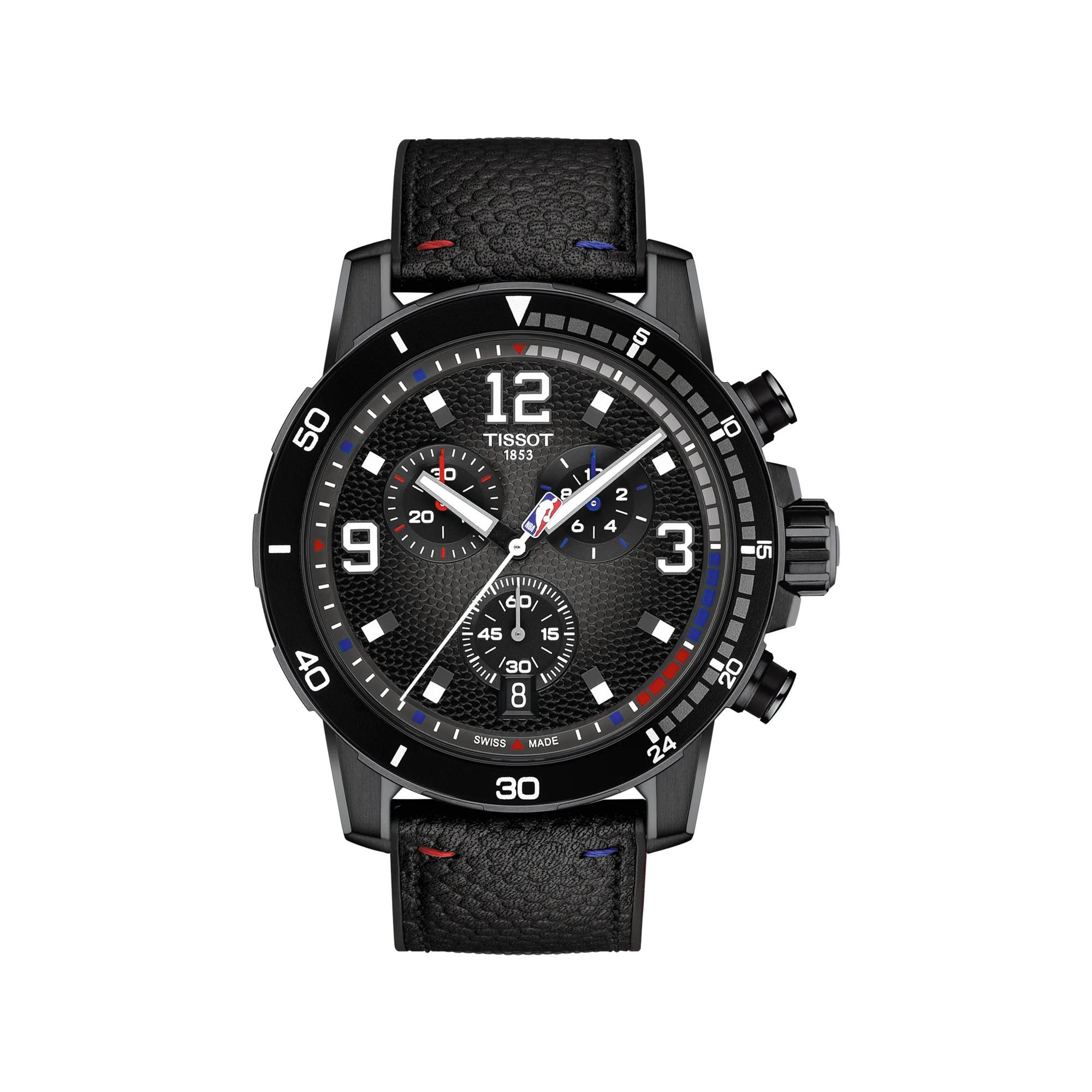 Die Tissot NBA Supersport Special Edition ist eine sportliche Uhr mit einem markanten 45,5 mm Edelstahlgehäuse und schwarzer PVD-Beschichtung. Sie verfügt über kratzfestes, entspiegeltes Saphirglas und eine Aluminiumlünette mit 24-Sekunden-Markierungen, inspiriert von der Tissot Shot-Clock der NBA. Das Zifferblatt im Basketballstil hat einen Farbverlauf von Dunkelgrau zu Schwarz und Indizes, die Spielernummern ähneln. Ein schwarzes Zwei-Komponenten-Armband ergänzt das Design und kann dank Schnellwechselsystem leicht ausgetauscht werden. Der Gehäuseboden zeigt eine Gravur des NBA-Logos, umgeben von den Städten und Staaten der NBA-Teams. Ein präzises Swiss Made Quarz-Chronographenwerk sorgt für exakte Zeitmessung.