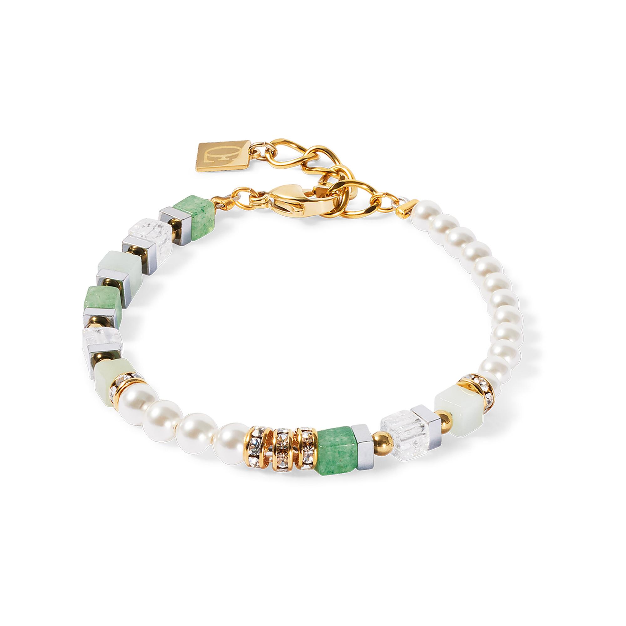 Natürlich schön, verspielt elegant – das Precious Fusion Offset Armband gold-grün kombiniert die lebhaften Grüntöne von Amazonit, grünem Aventurin und Bergkristall mit den sanft schimmernden weissen Swarovski® Kristallperlen. Goldene Edelstahldetails verleihen dem Armband einen raffinierten Touch, während das versetzte Design einen modernen, leichten Look schafft. Ein perfekter Begleiter für stilvolle Looks mit einem Hauch von Natur.